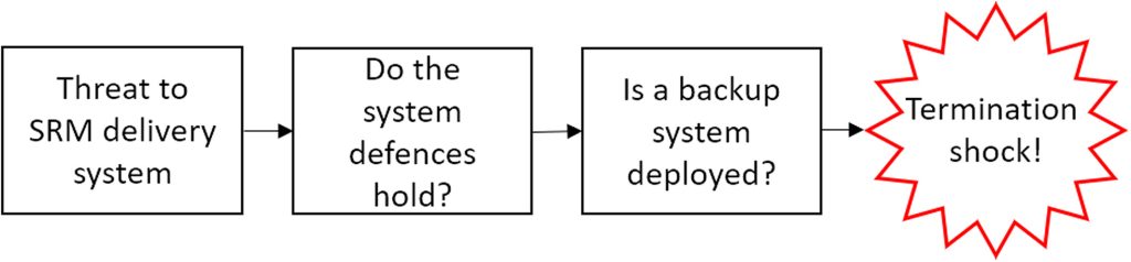 Če bi se sončno geoinženirstvo uporabilo za prikrivanje visoke stopnje globalnega segrevanja in bi se nato nenadoma ustavilo, bi prišlo do hitrega in škodljivega dviga temperatur. Ta učinek se pogosto imenuje terminacijski šok in je vpliven pojem. Na podlagi študij njegovih potencialnih vplivov komentatorji pogosto navajajo terminacijski šok kot eno največjih tveganj sončnega geoinženirstva. Vendar pa se verjetnost terminacijskega šoka doslej ni preveč obravnavala, zato so zaključki o njegovem tveganju prezgodnji. Ta članek raziskuje fizikalne lastnosti terminacijskega šoka, nato pa z enostavno analizo scenarijev nariše poti, po katerih bi različni sprožilni dogodki (kot so teroristični napadi, naravne nesreče ali politični ukrepi) lahko pripeljali do prekinitve. Nato razmišlja, kje bi lahko pravočasne politike posredovale, da bi preprečile terminacijski šok. Ugotavljamo, da bi nekatere relativno preproste politike lahko zaščitile sistem sončnega geoinženiringa pred večino verjetnih sprožilcev. Če bi se vzdrževala rezervna oprema za razporeditev in če bi se sončno geoinženiring izvajalo na podlagi sporazuma med le nekaj vplivnimi državami, bi sistem moral biti odporen proti vsem razen najbolj ekstremnim katastrofam. Če je ta analiza pravilna, bi moral biti šok zaradi prekinitve veliko manj verjeten in zato veliko manj tvegan, kot se je prej domnevalo. Za bolj poglobljene zaključke glede politik bo potrebna veliko bolj sofisticirana analiza scenarijev, ki bo presegala zgolj simulacije najslabših scenarijev.