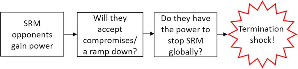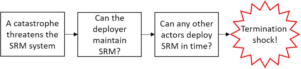 - Nismo našli nobenega razloga, da bi zavrnili nevarnost šoka ob prenehanju (terminacijskega šoka). Upravljanje tega tveganja bi moralo biti ključna skrb, če se kdaj razmišlja o uporabi upravljanja sončnega sevanja (Solar Radiation Management – SRM).