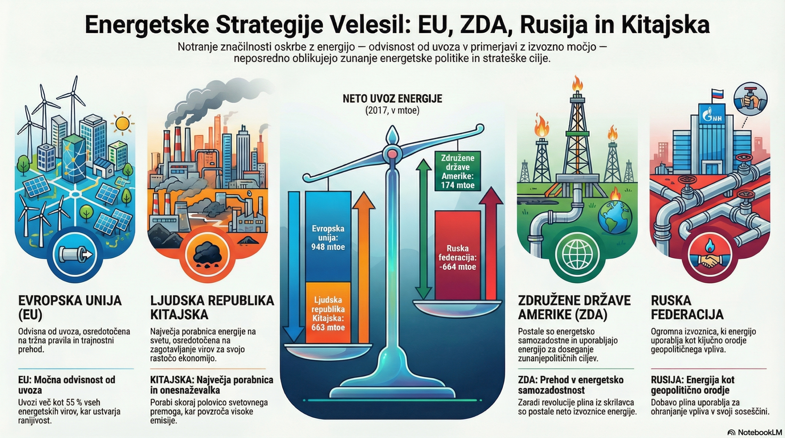 Disertacija analizira zunanjo energetsko politiko štirih svetovnih velesil skozi prizmo teorije neofunkcionalizma, pri čemer izpostavlja razlike med njimi. Avtor ugotavlja, da Evropska unija edina uspešno uporablja nadnacionalne mehanizme in učinek prelivanja za integracijo trgov, medtem ko so modeli v Rusiji, Kitajski in ZDA bolj odvisni od državnega nadzora ali multilateralnega sodelovanja. Raziskava poudarja, da sta varnost oskrbe in trajnostni razvoj ključna cilja, ki oblikujeta geopolitične odnose in konkurenčnost na globalnih trgih. Viri podrobno opisujejo preobrazbo Združenih držav v energetsko neodvisno izvoznico ter rusko uporabo energetskih virov kot sredstva za ohranjanje prevlade v postsovjetskem prostoru. Hkrati besedilo opozarja na naraščajoč vpliv Kitajske in njene pobude “En pas, ena pot”, ki širi gospodarski vpliv brez prenosa suverenosti. Celotna študija tako nudi celovit vpogled v pravne okvirje, okoljsko zakonodajo in strateške interese, ki usmerjajo sodobno svetovno energetiko.
