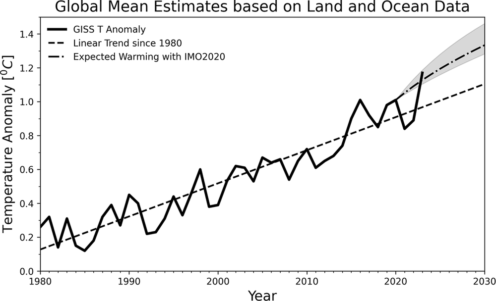 Trendna črta je prekinjena. Pričakovani potek segrevanja iz kombinacije linearnega trenda in izračunanega učinka segrevanja iz šoka regulacije IMO 2020 (International Maritime Organization – IMO) na podlagi modela energetske bilance. Zgornja in spodnja meja pričakovanega segrevanja sta prikazani v senčenih barvah. Referenčno obdobje za temperaturne anomalije je med letoma 1951 in 1980.