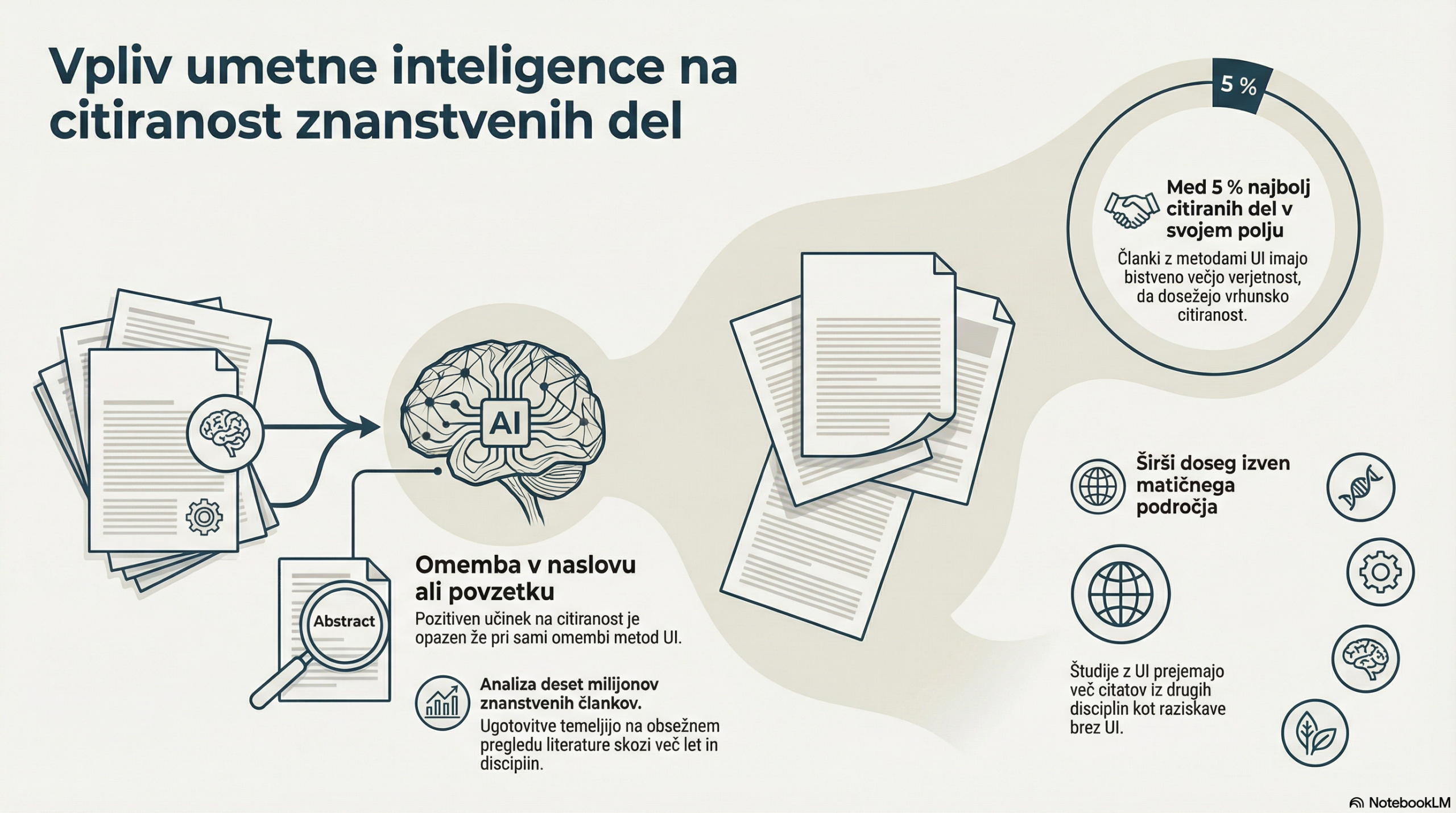- Povečanje citiranosti: Članki, ki v naslovih ali povzetkih omenjajo metode umetne inteligence (UI), imajo bistveno večjo verjetnost, da se uvrstijo med 5 % najbolj citiranih del na svojem področju.
