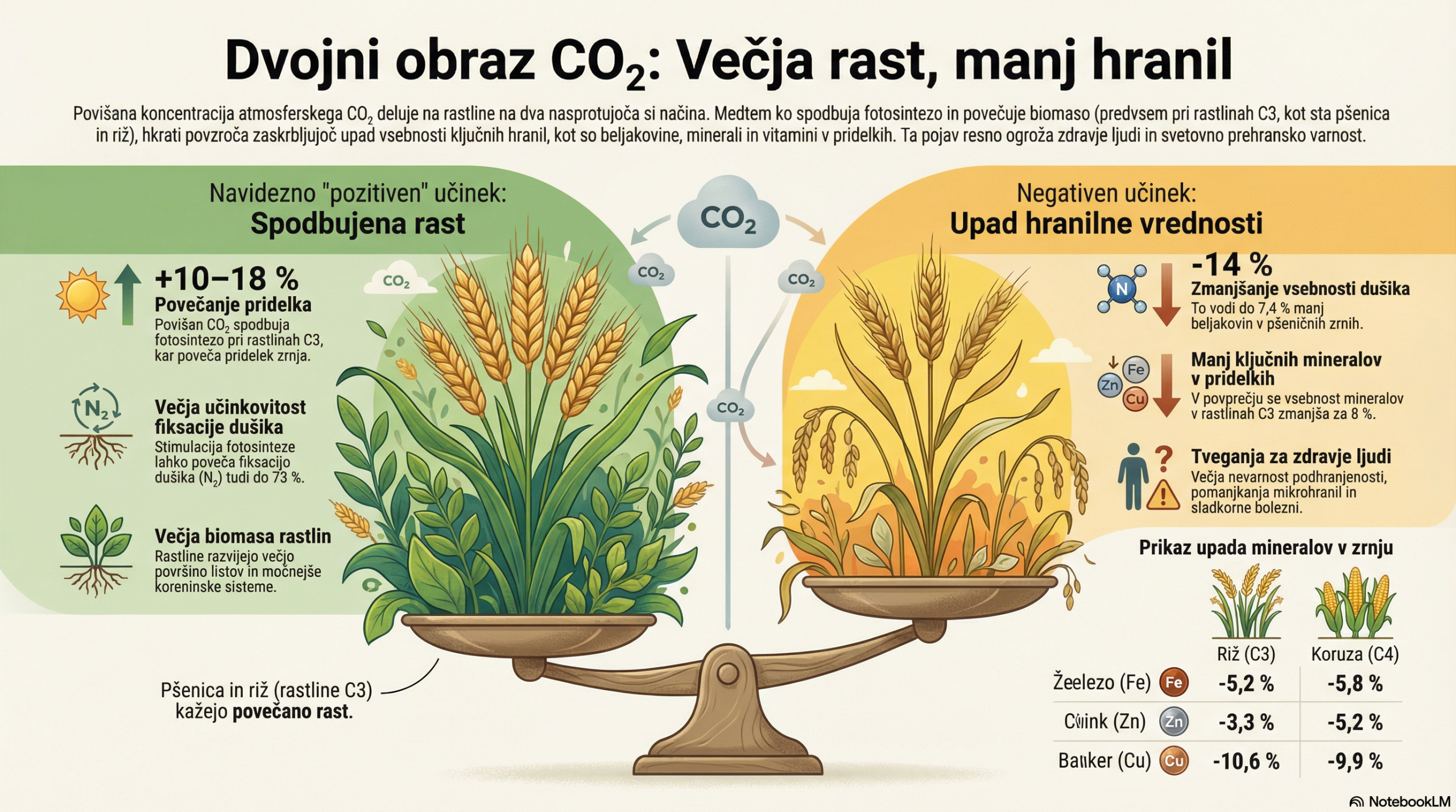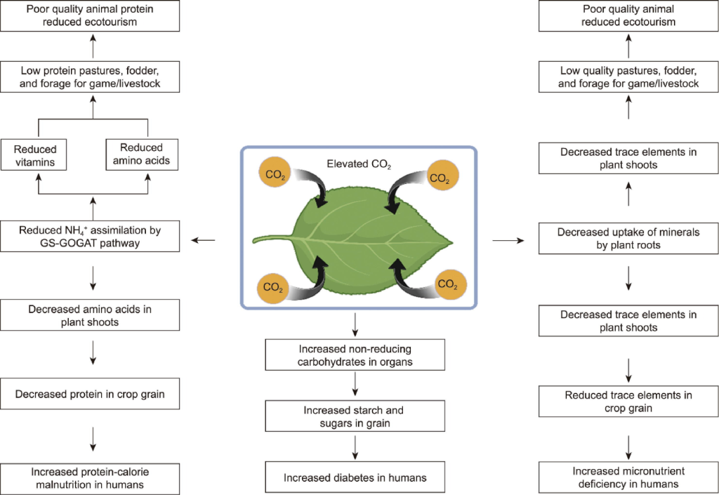 Kljub negativnim vplivom na delovanje rastlin, podnebne spremembe koristijo rastlinam na celični ravni. Na primer, stimulacija C3 fotosinteze z višjo vsebnostjo CO2 lahko poveča fiksiranje N2 za 73 % in pridelek zrnja za 10–11 %. Globalno povečana koncentracija CO2 v atmosferi je že zmanjšala vsebnost dušika v C3 poljščinah in C3 lesnati vegetaciji za 14 % oziroma 21 %, ne glede na dodano dušikovo gnojilo. 15N-poskusi hranjenja so pokazali, da se je po 19 urah pod povišanim CO2 koncentracija 15N v steblih, koreninah in koreninskih gomoljih ter celotnih rastlinah Scirpus olneyi (S. olneyi) zmanjšala za 51 %, 63 % oziroma 74 %. Poleg tega je S. olneyi pokazal zmanjšano asimilacijo NH4+ v povišanem CO2, kar je zmanjšalo vsebnost aminokislin v steblih za 25,6 % za glicin in 65,0 % za serin, v koreninah in korenikah pa za 2 % za gama-aminomaslino (GABA) in 80 % za glutamat. Ugotovljeno je bilo tudi, da se beljakovine v pšeničnih zrnih zmanjšajo za 7,4 % pri povišanih vrednostih CO2 zaradi zmanjšanja treonina, valina, izoleucina, leucina in fenilalanina. Podobno je bilo ugotovljeno, da se vsebnost mineralnih hranil v riževih in koruznih zrnih pri visokih vrednostih CO2 zmanjša za 1,0 % in 7,1 % za fosfor, 7,8 % in 2,1 % za žveplo, 5,2 % in 5,8 % za železo, 3,3 % in 5,2 % za cink, 10,6 % in 9,9 % za baker ter 7,5 % in 4,2 % za mangan. Na splošno se predvideva, da se bodo koncentracije mineralov v C3 rastlinah pri povišanih vrednostih CO2 zmanjšale za 8 %, medtem ko se bo skupna vsebnost nestrukturnih ogljikovih hidratov (predvsem škrob in sladkorji) povečala. To zmanjšanje vsebnosti beljakovin, aminokislin in mineralnih snovi v žitu bi lahko podvojilo pojavnost globalne beljakovinsko-kalorične podhranjenosti in pomanjkanja mikrohranil, zlasti v Afriki, kjer so kmetijska tla že sama po sebi revna s hranilnimi elementi. Poleg tega bi povečanje skupnih nestrukturnih ogljikovih hidratov (predvsem škroba in sladkorjev) v žitnih pridelkih lahko povečalo pojavnost diabetesa zaradi močne odvisnosti od škrobnih prehran. Negativni učinki povečane koncentracije CO2 na riž, koruzo in pšenico – tri najpomembnejše osnovne pridelke na svetu – kažejo na povečanje globalne negotovosti preskrbe s hrano zaradi naraščajoče koncentracije CO2 v ozračju.