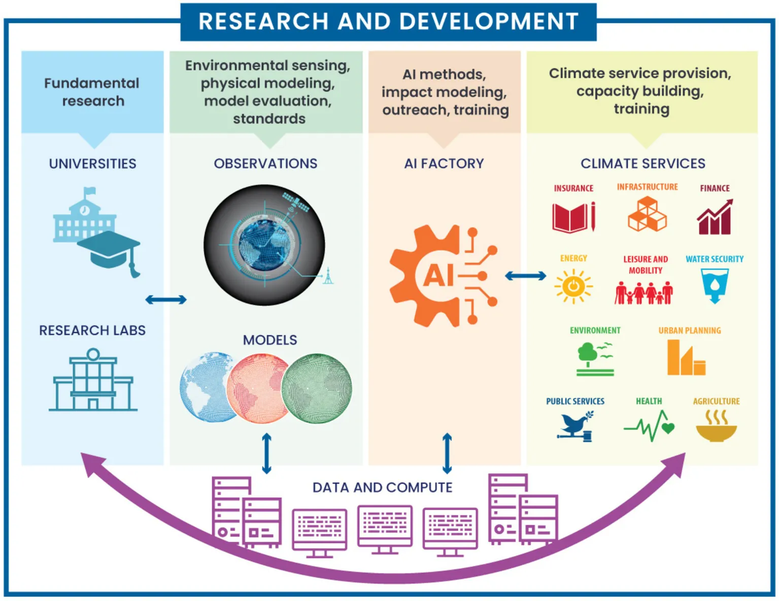 Slika: Predstavitev toka, ki povezuje temeljne raziskave z zagotavljanjem informacij za podnebne storitve, vključno z orodji za opazovanje in napovedovanje modelov ter „tovarniškimi umetno inteligentnimi sistemi“ za lokalne in družbeno pomembne informacije. Prilagojeno po Bjorn Stevens, Inštitut Max Planck za meteorologijo