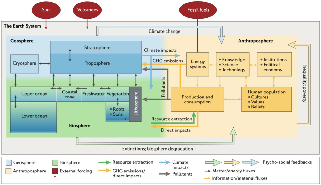 Slika: Predstavitev zemeljskega sistema, vključno s fizikalnimi in biogeokemičnimi procesi, ki vplivajo na planet Zemljo, ter notranjo dinamiko človeškega sistema (antroposfera), opisano s sistemom proizvodnje in porabe. Ta sistem „poganjajo“ energetski sistemi, modulirajo pa ga človeške družbe, na katere vplivajo njihove kulture, vrednote, institucije in raven izobrazbe. Interakcije znotraj zemeljskega sistema so dvosmerne, pri čemer antropogene emisije toplogrednih plinov in drugih onesnaževal ter izkoriščanje virov povzročajo vplive, ki se odražajo v sistemu geosfere in biosfere. Pomembne so tudi povratne informacije za antroposfero, vključno z neposrednimi vplivi podnebnih sprememb in degradacije biosfere, pa tudi psihosocialne povratne informacije iz preostalega zemeljskega sistema in znotraj antroposfere. Vir: Steffen et al. (2020); https://www.nature.com/articles/s43017-019-0005-6. Reprodukcija z dovoljenjem.