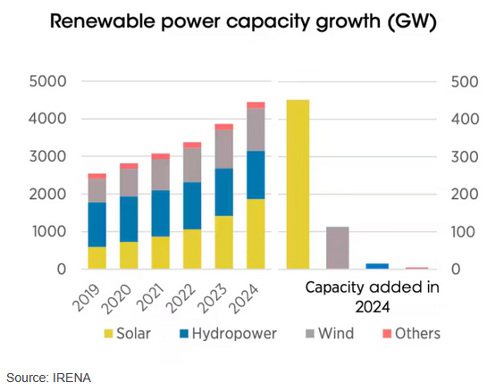 Prispevek na spletnem portalu Carbon Credits pod novicami objavlja zaključke zadnjega poročila Mednarodne agencije za obnovljivo energijo (angl. International Renewable Energy Agency – IRENA), da smo na svetu v letu 2024 zmogljivosti obnvljie energije v višini 582 MWh.