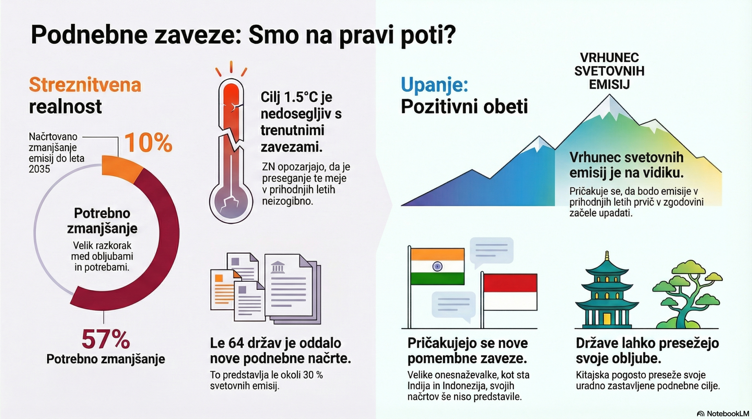 - Prihodnja usmeritev: ZN so prepričani, da bodo svetovne emisije dosegle vrhunec in začele upadati prvič po industrijski revoluciji. Strokovnjaki ugotavljajo, da nekatere države (kot je Kitajska) pogosto “presežejo” zastavljene cilje.