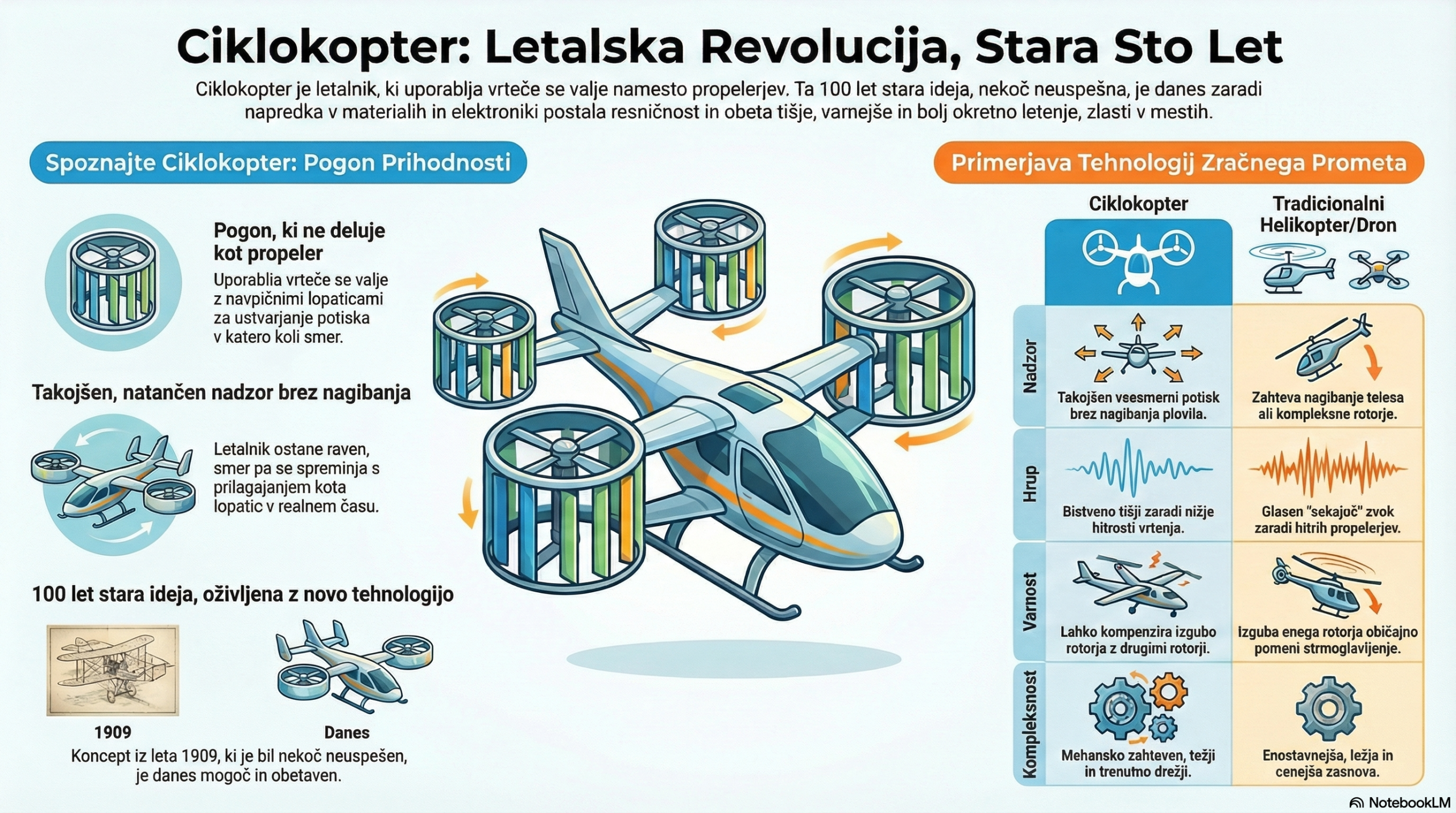 Videoposnetek (11:45) na YouTube kanalu The Forge Empire, ki s preko 400 videoposnetki odkriva področje odkritij in inovacij, predstavlja Cyclocopter – leteči stroj, ki ga poganjajo vrteči se valji in se lahko premika v katerokoli smer brez nagibanja. Cikloidni pogon, ki je bil pred več kot stoletjem pozabljen koncept, se zdaj vrača s sodobno tehnologijo in obeta tišjo, varnejšo in bolj agilno prihodnost v zraku.