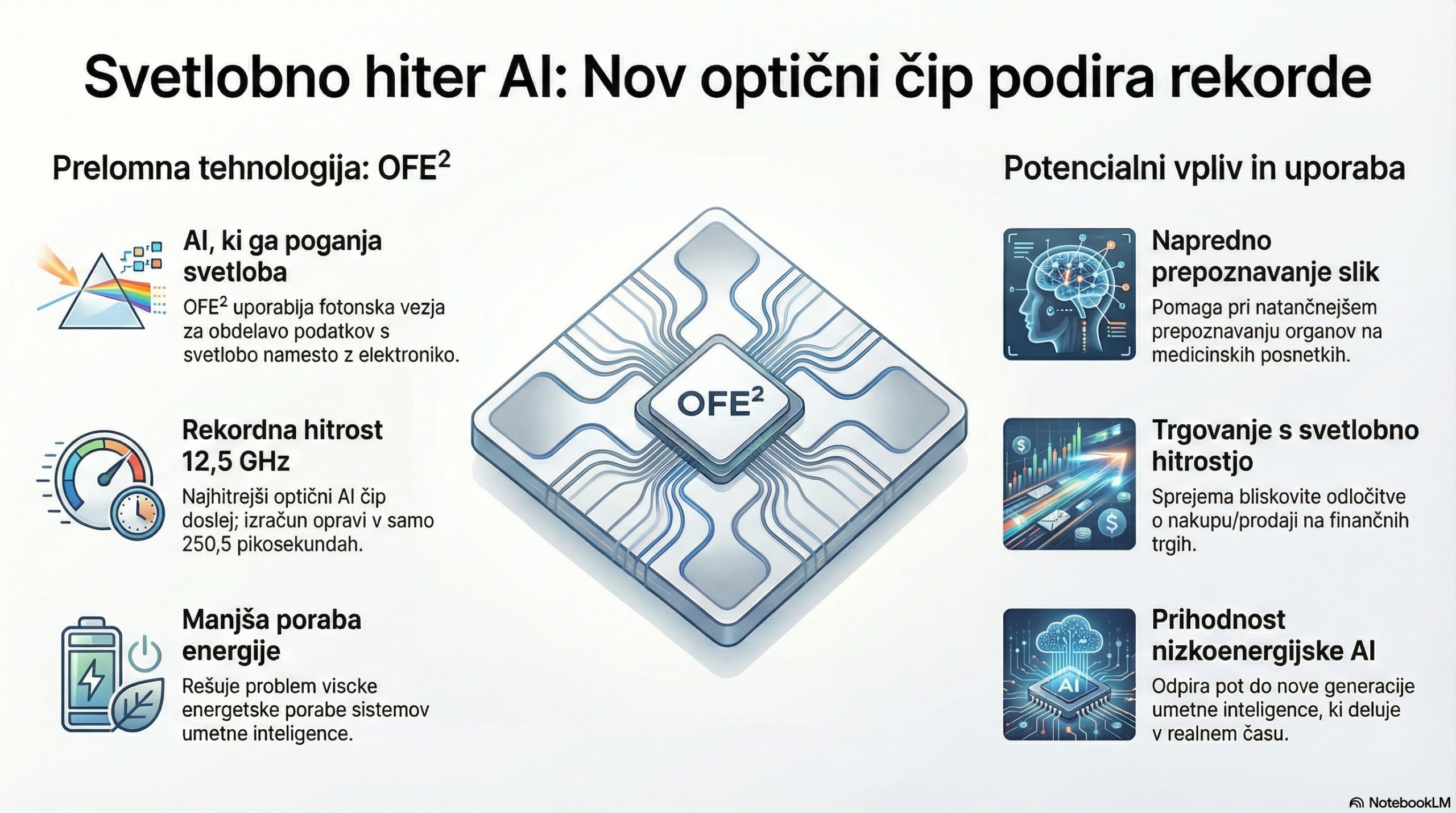 Prispevek na spletnem portalu Gadgets360 v rubriki Science News o tem, da so znanstveniki z univerze Tsinghua na Kitajskem razvili svetlobni UI čip OFE2 (angl. Optical Feature Extraction Engine – OFE2), ki uporablja fotonsko vezje za obdelavo podatkov s hitrostjo 12,5 GHz. Prispevek temelji na članku: Sun R et al. (2025) High-speed and low-latency optical feature extraction engine based on diffraction operators. Advanced Photonics Nexus 4, 5, 056012 – https://doi.org/10.1117/1.APN.4.5.056012 – open access article pdf –