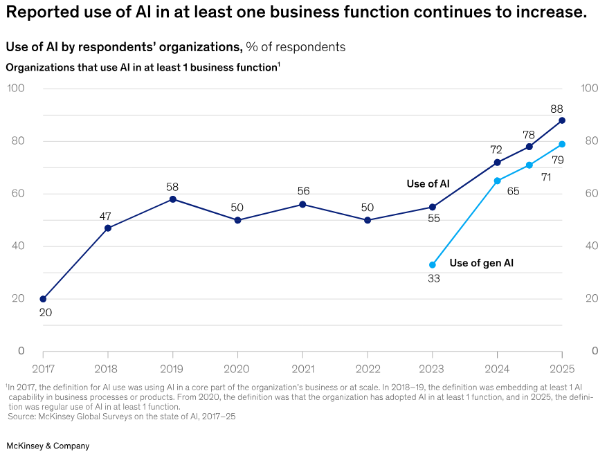 Na podlagi McKinseyjeve svetovne raziskave za leto 2025 je tukaj povzetek trenutnega stanja uvajanja umetne inteligence (UI).