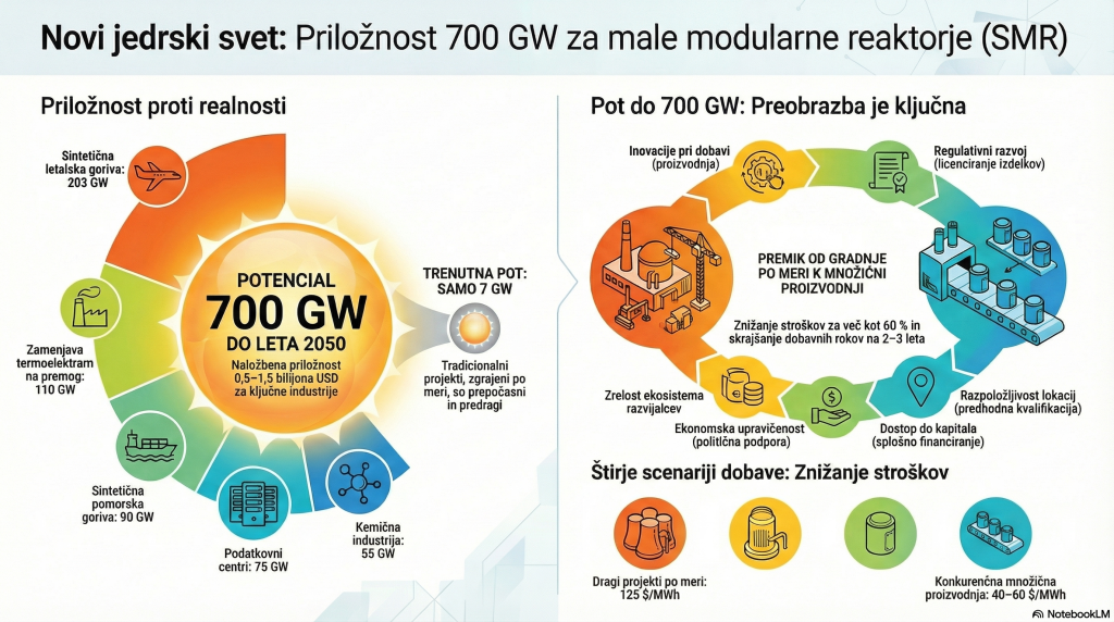- SMR bi lahko pokrile več kot 80 % potreb po čisti in zanesljivi energiji vsaj 11 ključnih industrijskih sektorjev (vključno z obetavnimi industrijami), kot so podatkovni centri, obnovitev premogovnih elektrarn, kemikalije in trajnostna (sintetična) goriva.
