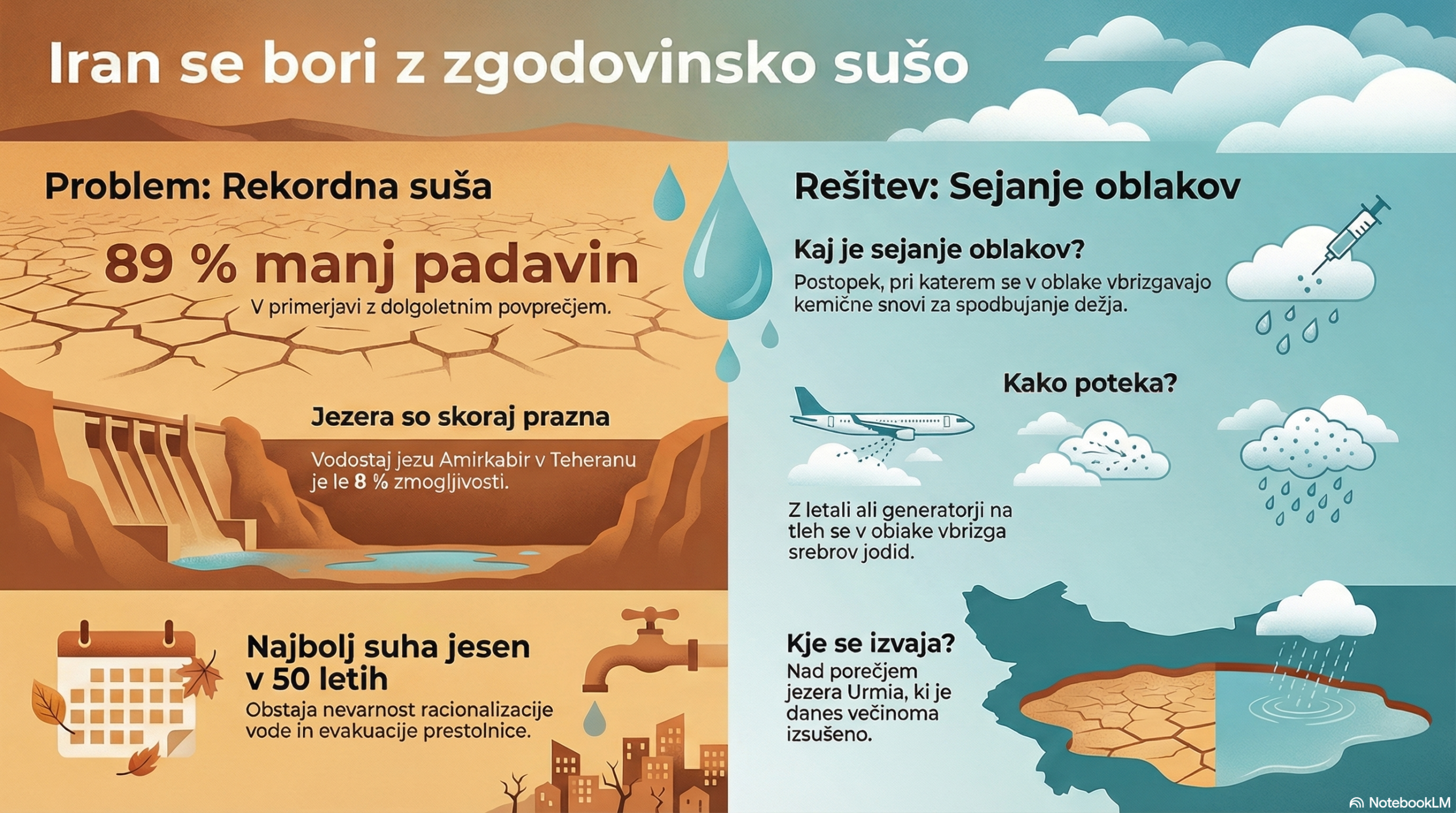 Prispevek na spletnih straneh BBC News o prizadevanjih irnaskih oblasti, da bi posipavanjem oblakov ustvarili umetni dež in omilili zgodovinsko sušo v državi.