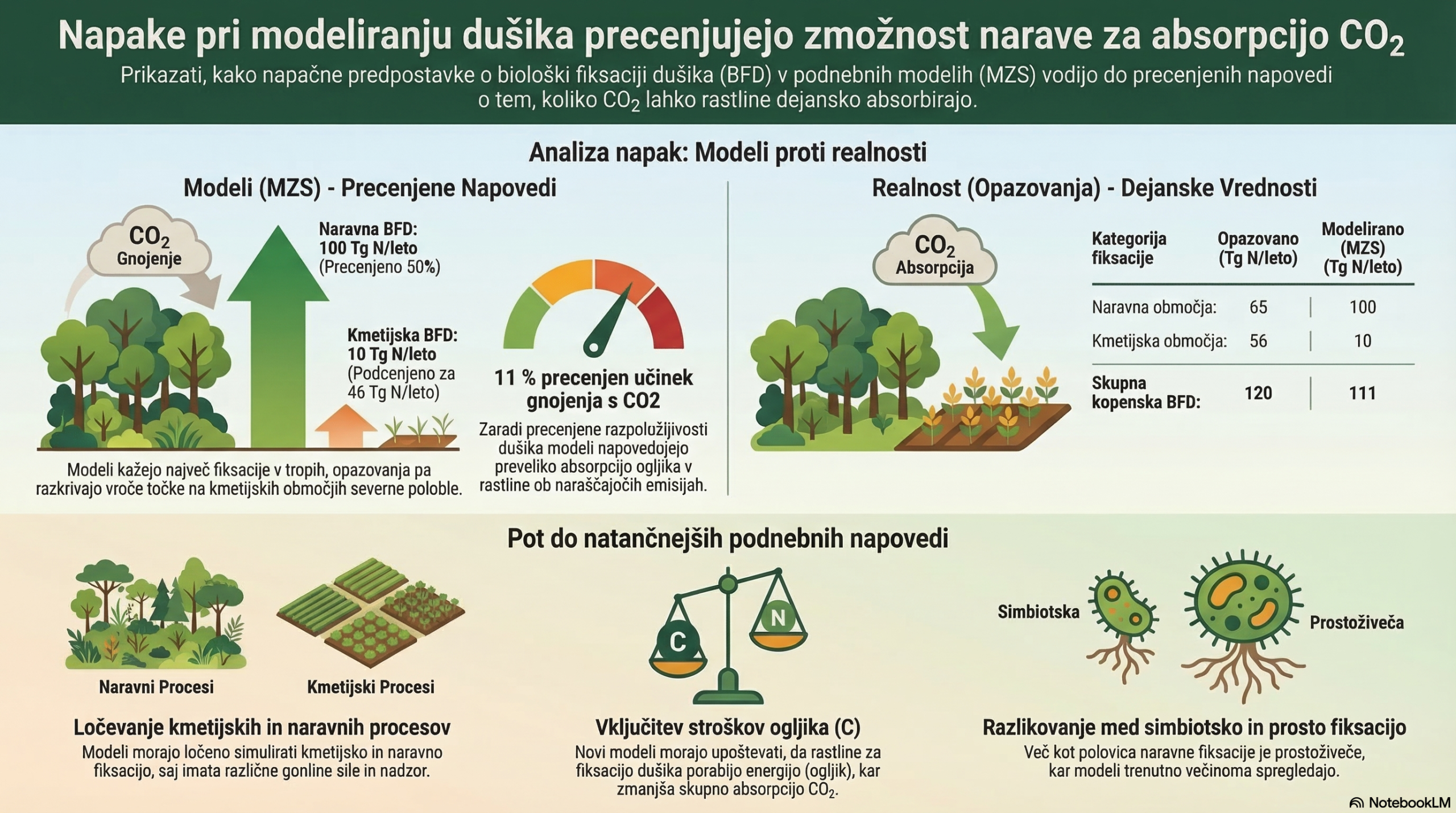 Modeli zemeljskega sistema (angl. Earth system models – ESM) se uporabljajo za napovedovanje podnebnih sprememb, ki so delno odvisne od količine ogljika, ki jo rastline vežejo. Dušik je ključno omejevalno hranilo za rast rastlin in vezavo ogljika, zato se vedno pogosteje vključuje v modele ESM. Vendar se modeli ESM med seboj močno razlikujejo v načinu simulacije kopenske biološke fiksacije dušika (BNF), ki je glavni naravni vir dušika za kopenske ekosisteme. Pokazali smo, da večina ESM-ov netočno simulira kopensko BNF, kar se razlikuje od nove globalne sinteze meritev kopenske BNF v naravnih in kmetijskih biomih. ESM-i znatno podcenjujejo kmetijsko BNF. ESM-i precenjujejo BNF v gozdovih in travnikih, ki so ekosistemi z največjim sprejemom ogljika. Posledično bi ESM-i lahko pretiravali s sprejemom ogljika v rastlinah, ko se koncentracija CO2 v atmosferi povečuje.