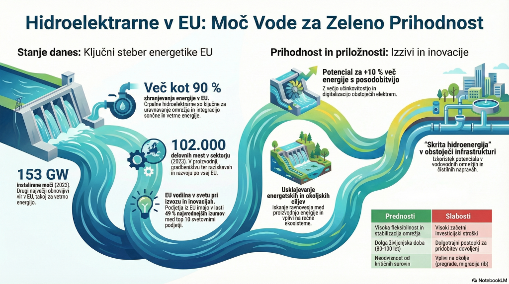 Leta 2022 je Evropska komisija ustanovila Observatorij za tehnologije čiste energije (CETO), da bi obravnavala zapleten prehod na podnebno nevtralno družbo, pri čemer je poudarila napredne tehnologije in inovacije v sektorjih, kot je hidroenergetika. Energetska kriza, ki jo je povzročila vojna proti Ukrajini, je poudarila ključno vlogo hidroenergetike pri zagotavljanju stabilnosti omrežja in razpoložljive proizvodnje, pa tudi dodatne oskrbe z vodo in omrežnih storitev. Hidroelektrarne s črpanjem vode hranijo več kot 90 % energije, medtem ko je proizvodnja iz tradicionalnih hidroelektrarn zagotovila 10 % celotne proizvodnje električne energije v EU. Večje naložbe v obratovanje hidroelektrarn so bistvene za obvladovanje znatnega povečanja ciklov zaustavitve in zagona, ki jih povzroča nestabilnost proizvodnje električne energije iz vetrne in fotovoltaične energije, ter za zagotavljanje prožnosti energetskega sistema. Hidroelektrarne so vodilne med obnovljivimi viri energije v EU: hidroelektrarne v EU so večinoma „proizvedene v EU“ in imajo stoletno zgodovino. Hidroelektrarne v EU prispevajo največji delež k svetovnemu izvozu in imajo največji delež visokokakovostnih izumov med 10 največjimi svetovnimi podjetji. Hidroelektrarni rezervoarji zagotavljajo tudi storitve v sektorju integriranega upravljanja z vodami, od nadzora poplav do oskrbe z vodo v sušnih obdobjih, in shranjujejo največjo količino vode med vsemi vrstami vodnih rezervoarjev v EU. Shranjevanje vode je ključna možnost za spopadanje s podnebnimi spremembami in povečanim neskladjem med povpraševanjem po vodi in njeno razpoložljivostjo, kot je navedeno tudi v novi strategiji EU za odpornost vodnih virov. Vendar lahko jezovi v sistemih sladkovodnih in obalnih voda povzročajo okoljske škode in zahtevajo velike začetne investicijske stroške. Zato je treba ob upoštevanju daljnosežnih učinkov na povezave med vodo, energijo, družbo in ekosistemom trajnostna hidroenergija doseči dobro ravnovesje med proizvodnjo električne energije in storitvami električnega omrežja, vplivi na ekosisteme in koristmi za družbo, kar podpira doseganje ciljev zelenega sporazuma in ciljev politik na področju obnovljive energije in vode/okolja. V EU obstaja več možnosti za trajnostno hidroenergijo, ki ne povečujejo fragmentacije rek in zmanjšujejo škodljive vplive, ki so povzete v tem poročilu. Hidroenergija ostaja ključna tehnologija za okrepitev konkurenčnosti EU v vse bolj zahtevnem svetu in za podporo prehodu na zeleno energijo.