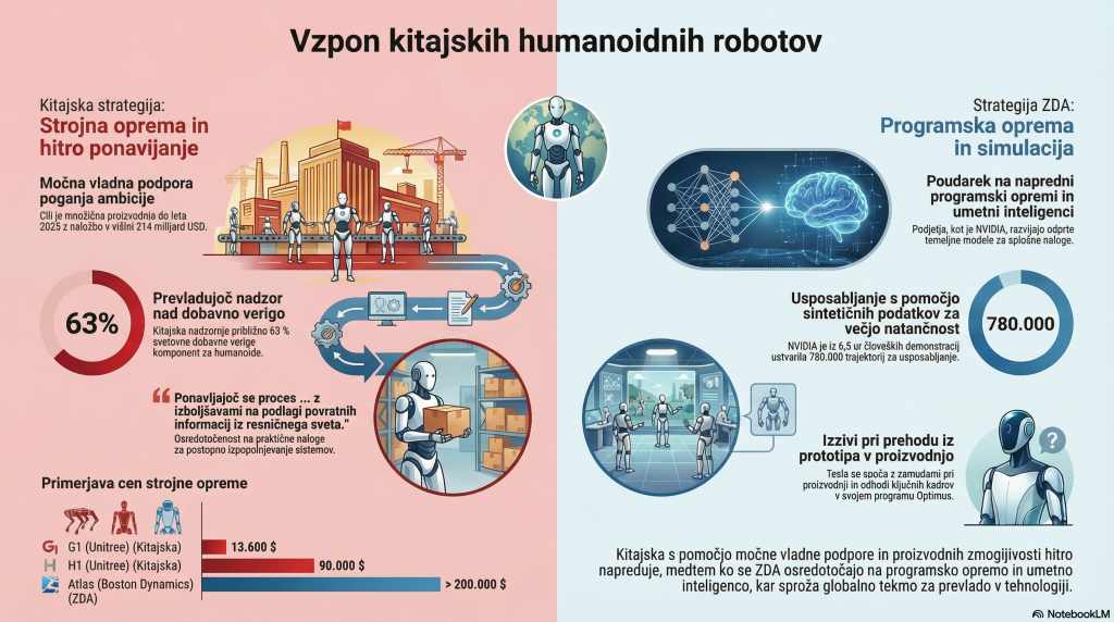 - Vladni načrti: Kitajsko ministrstvo za industrijo in informacijsko tehnologijo načrtuje masovno proizvodnjo humanoidnih robotov do konca leta 2025 in razvoj samoučečih strojev do leta 2027, kar je podprto z 214 milijardami USD javnih naložb.