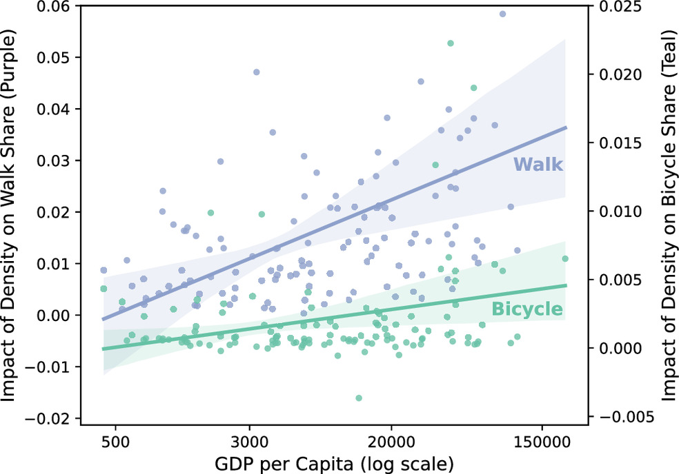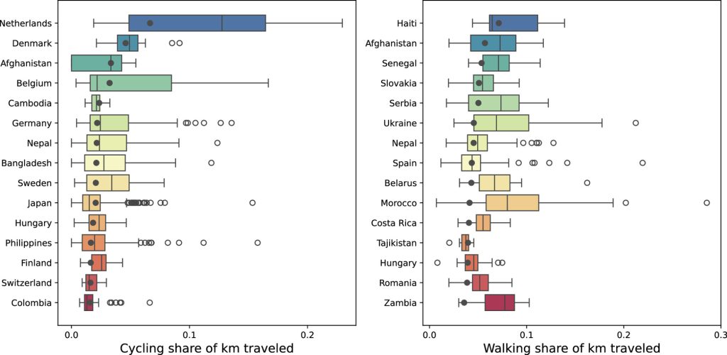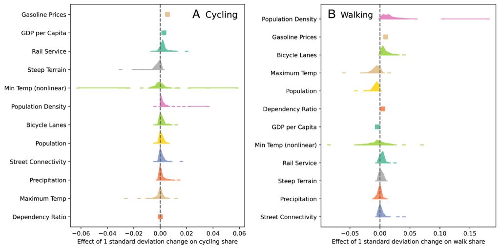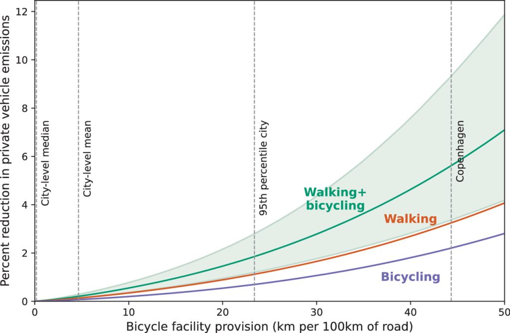Uporabljamo globalno usklajen niz podatkov – Google Environmental Insights Explorer – za količinsko opredelitev vpliva urbane oblike in prometne infrastrukture na stopnjo hoje in kolesarjenja v 11.587 mestih iz 121 držav na šestih celinah. Na ravni mesta ima gostota prebivalstva največji vpliv na delež hoje in pozitivni vpliv tudi na kolesarjenje, saj višja gostota prebivalstva omogoča, da so destinacije v dosegu hoje in kolesarjenja. Gostota prebivalstva ima največji vpliv v bogatejših državah, kjer imajo potniki pogosto več možnosti potovanja, medtem ko v krajih z nižjimi dohodki hojo in kolesarjenje pogosto poganjajo finančne omejitve. Ugotovili smo tudi pozitivne učinke kolesarskih stez (ki nadomeščajo širši nabor praks oblikovanja ulic) na hojo in kolesarjenje. V povprečnem mestu je vsak nov kilometer kolesarske steze povezan z ~13.400 dodatnimi kilometri kolesarjenja na leto. Če bi vsako mesto povečalo obseg svojega kolesarskega omrežja na raven Kopenhagna na Danskem, bi naše simulacije pokazale zmanjšanje emisij zasebnih vozil za približno 6 % in koristi za zdravje v višini približno 435 milijard USD na leto.