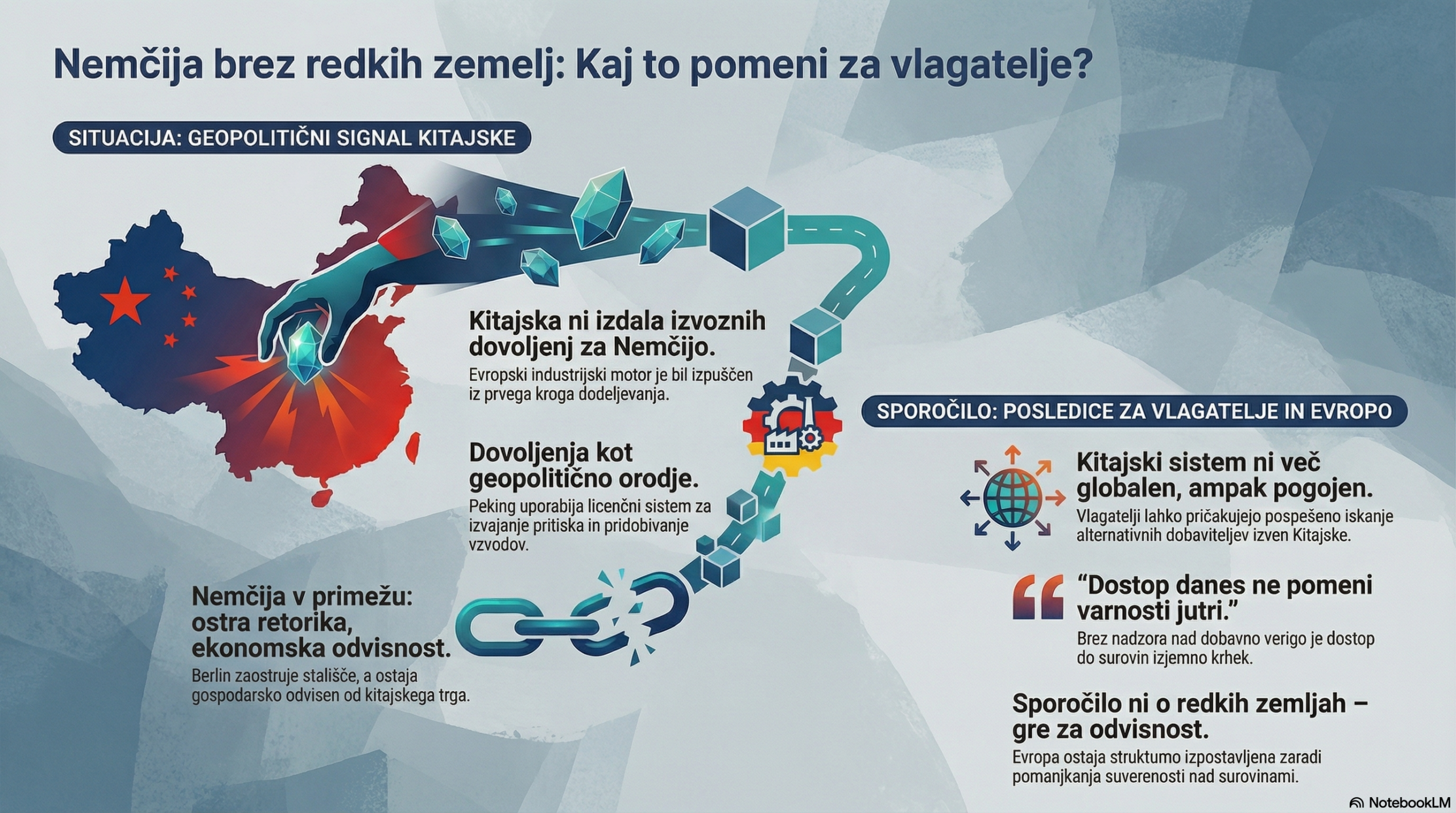 Prispevek na spletnem portalu Rare Earth Exchanges v rubriki News obravnava geopolitične posledice, ki jih prinaša kitajska zavrnitev izdaje izvoznih dovoljenj za redke zemeljske elemente nemškim industrijskim podjetjem. Kitajska uporablja svoj monopol nad temi kritičnimi surovinami kot strateško vzvodno sredstvo proti novi nemški vladi, ki zavzema strožje stališče do Pekinga. Ta poteza je povzročila resne motnje v ključnih sektorjih, kot so avtomobilska industrija, proizvodnja polprevodnikov in obrambna tehnologija po vsej Evropi. Zaradi nastale negotovosti se pričakuje, da bodo vlagatelji pospešeno preusmerili kapital v projekte zunaj Kitajske, da bi zagotovili stabilnost oskrbovalnih verig. Strokovnjaki ob tem opozarjajo, da mora Evropa nujno vzpostaviti lastno suverenost na področju surovin, če želi ohraniti svojo gospodarsko neodvisnost. Celotna situacija potrjuje, da so redke zemljine postale močno orodje v sodobnih trgovinskih vojnah.