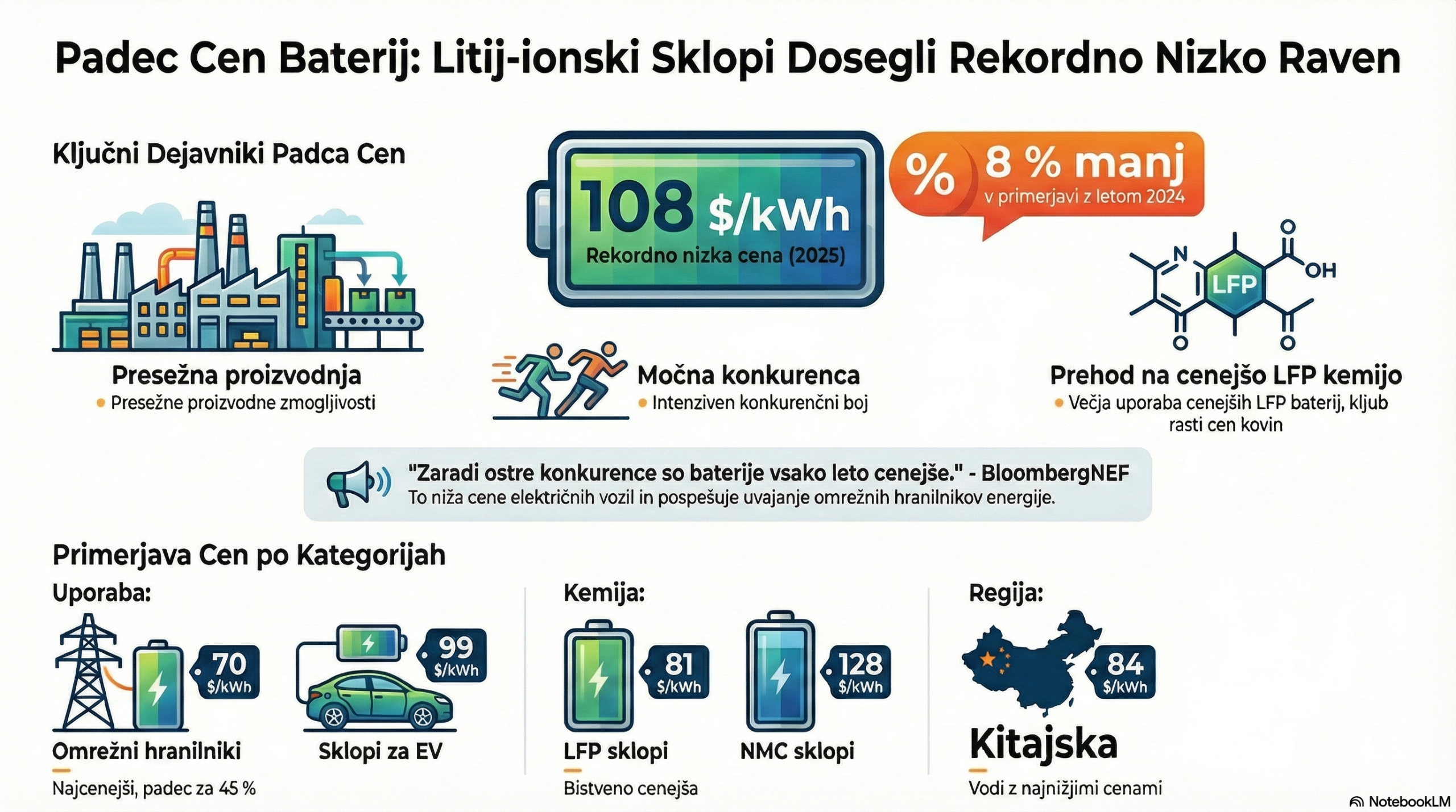 - Povprečna cena litij-ionskega baterijskega paketa je v letu 2025 dosegla rekordno nizko vrednost 108 $ na kilovatno uro (kWh), kar je 8-odstotni padec glede na leto 2024.