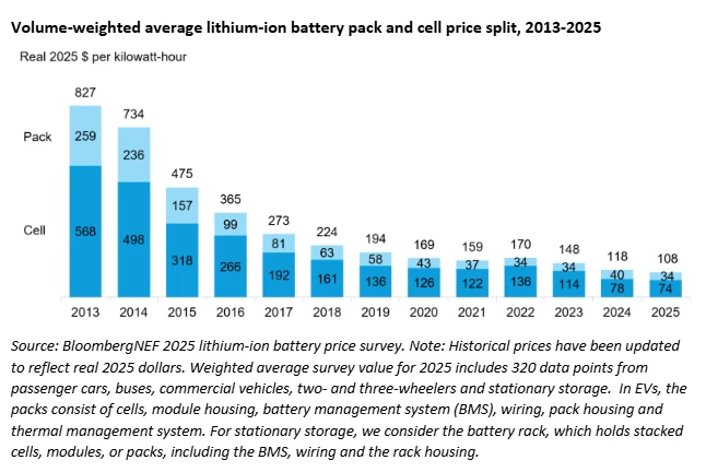 Prispevek na spletnem portalu Bloomberg NEF o cenah litij-ionijskih baterih v letu 2025. V nadaljevanju podajamo kratek povzetek prispevka.