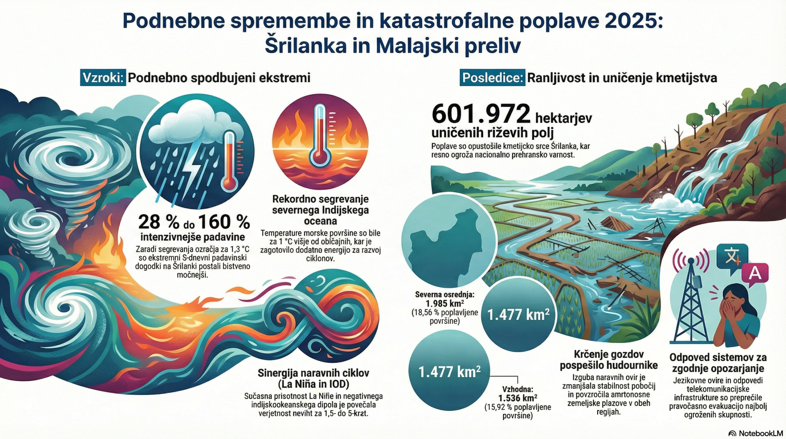 To znanstveno poročilo preučuje vpliv podnebnih sprememb na ekstremne padavine in uničujoče poplave, ki so novembra 2025 prizadele Šrilanko ter območje Malajskega preliva. Avtorji ugotavljajo, da so opazovani padavinski dogodki postali bistveno intenzivnejši zaradi globalnega segrevanja, pri čemer so k uničujočim učinkom prispevali tudi naravni pojavi, kot sta La Niña in negativni indijskookeanski dipol. Čeprav zgodovinski podatki kažejo na jasen trend povečevanja ekstremnih padavin, obstoječi podnebni modeli tega naraščanja ne uspejo v celoti zajeti, kar otežuje natančno kvantifikacijo človeškega vpliva. Poleg okoljskih dejavnikov poročilo izpostavlja visoko družbeno ranljivost, saj hitra urbanizacija in pomanjkljiva infrastruktura povečujeta izpostavljenost prebivalstva naravnim nesrečam. Analiza poudarja, da so se temperature morske gladine v Indijskem oceanu zvišale, kar zagotavlja več energije za nastanek tropskih ciklonov. Sklepna ugotovitev opozarja na nujnost izboljšanja sistemov zgodnjega opozarjanja in prilagoditve na vse pogostejše ekstremne vremenske pojave v regiji.