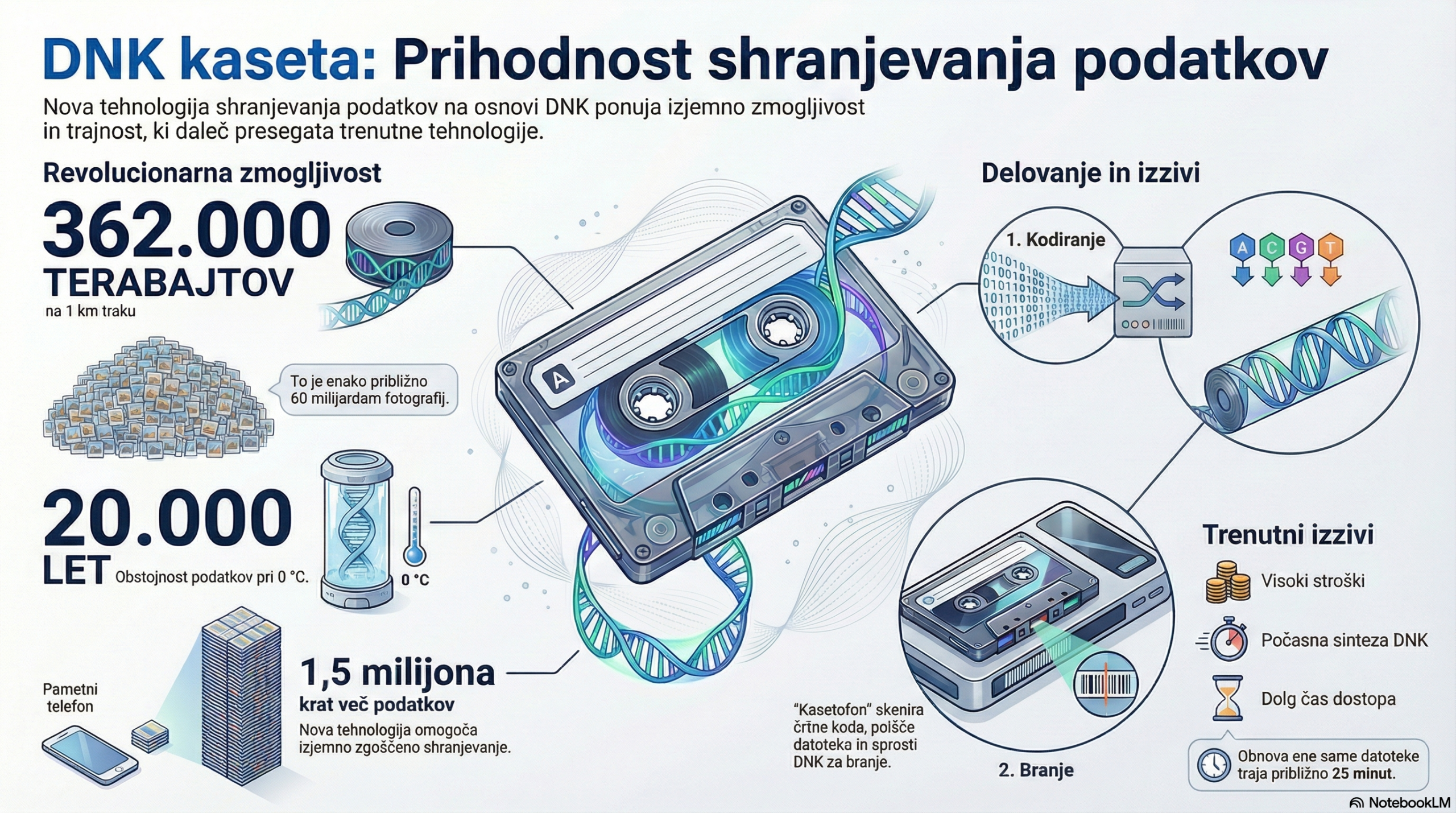 - Koncept: Digitalni podatki (slike, besedilo) so kodirani v zaporedja umetnih baz DNK (A, C, G, T) in natisnjeni na dolg plastičen trak (npr. 100 metrov).