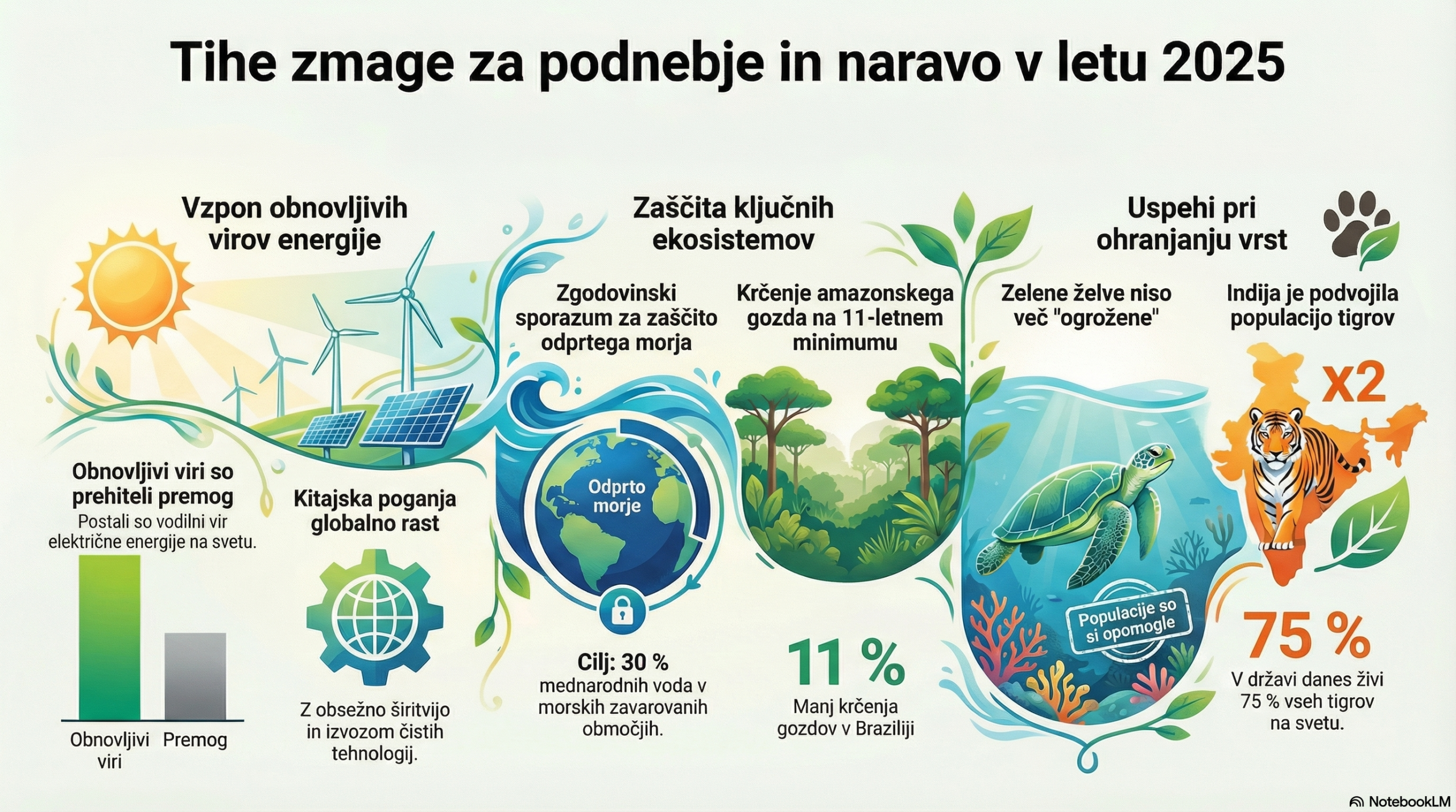 Prispevek na spletnem portalu BBC v rubriki Earth opisuje vrsto pozitivnih okoljskih premikov, ki so leta 2025 zaznamovali boj proti podnebnim spremembam in izgubi biodiverzitete. Izpostavlja svetovni vzpon obnovljivih virov energije, ki so prehiteli premog, ter nove mednarodne sporazume za zaščito oceanov in tropskih gozdov. Besedilo poudarja tudi uspešno obnovo ogroženih živalskih vrst, kot so tigri in morske želve, ter večji formalni vpliv staroselskih ljudstev pri odločanju o naravovarstvu. Pomemben mejnik predstavlja še prelomna pravna odločitev mednarodnega sodišča, ki državam olajšuje pregon odgovornih za onesnaževanje. Kljub nenehnim izzivom ti dosežki ponujajo oprijemljivo upanje za prihodnost našega planeta.