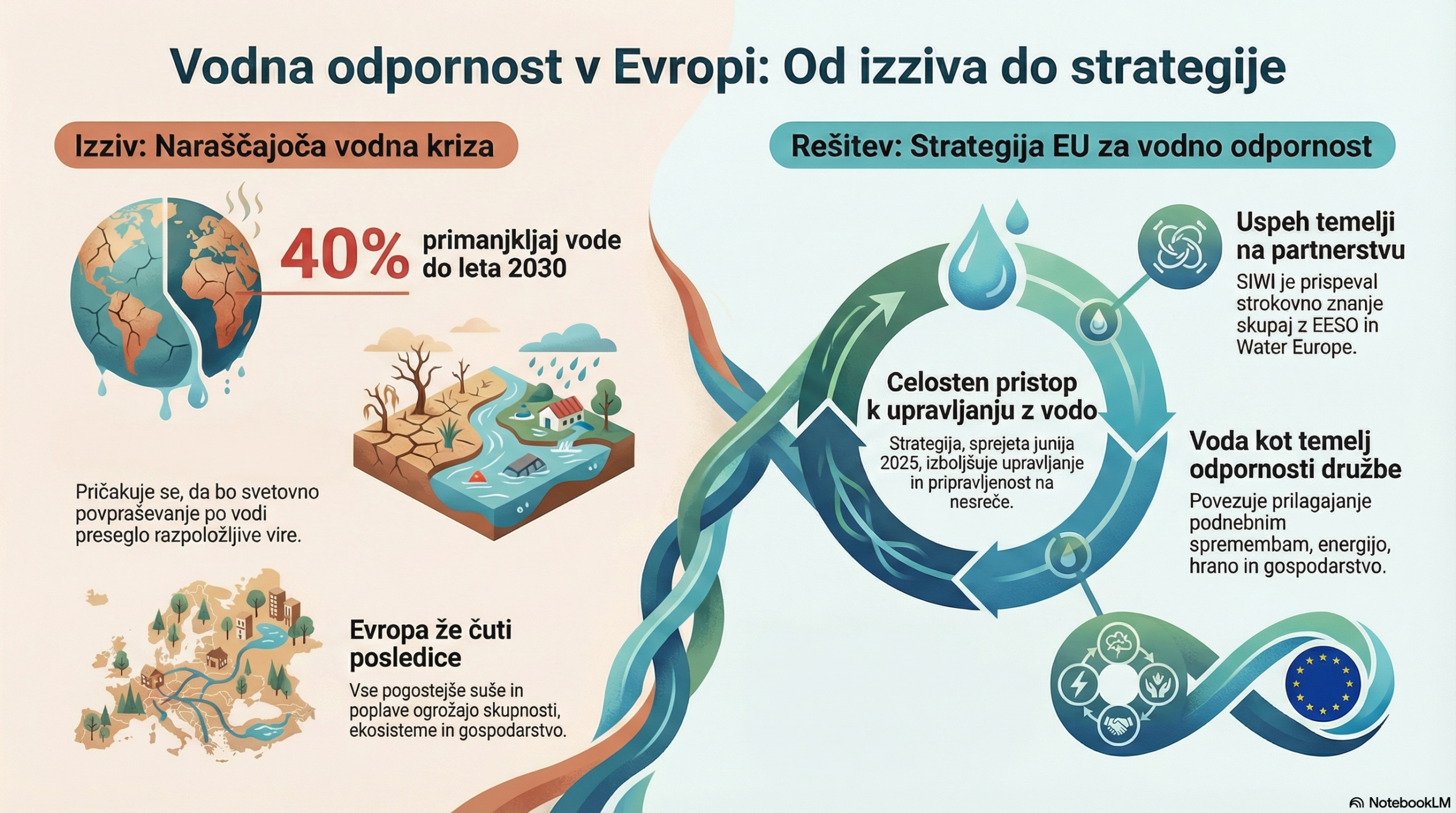 Blogovski prispevek na spletnih straneh Štockholmskega mednarodnega inštituta za vode (angl. Stockholm International Water Institute – SIWI) – vodilne svetovne strokovne ustanove za ravnanje z vodami – opisujejo dejavnosti in prednostne naloge organizacije SIWI pri spodbujanju odpornosti na področju voda in izboljšanju upravljanja s tem ključnim naravnim virom. Poseben poudarek je na dosežkih iz leta 2025, ko je organizacija aktivno sodelovala pri oblikovanju evropske strategije za odpornost voda, ki povezuje ekološko varnost s konkurenčnostjo gospodarstva. Besedilo izpostavlja, da so voda in podnebne spremembe neločljivo povezani, saj učinkovito upravljanje voda služi kot orodje za mir, trajnostni kmetijski razvoj in varovanje človekovih pravic. Strategija opredeljuje vodo kot strateško prednostno nalogo Evropske unije, ki zahteva tesno mednarodno sodelovanje in vključevanje lokalnega znanja. Avtorji ob koncu napovedujejo, da bo leto 2026 ključno za nadaljnjo uresničevanje politik, ki bodo naslovile naraščajoče svetovno pomanjkanje pitne vode in sanitarij. Vsi navedeni viri skupaj tvorijo celovit pregled prizadevanj za trajnostno prihodnost, v kateri voda ostaja temelj globalne stabilnosti.