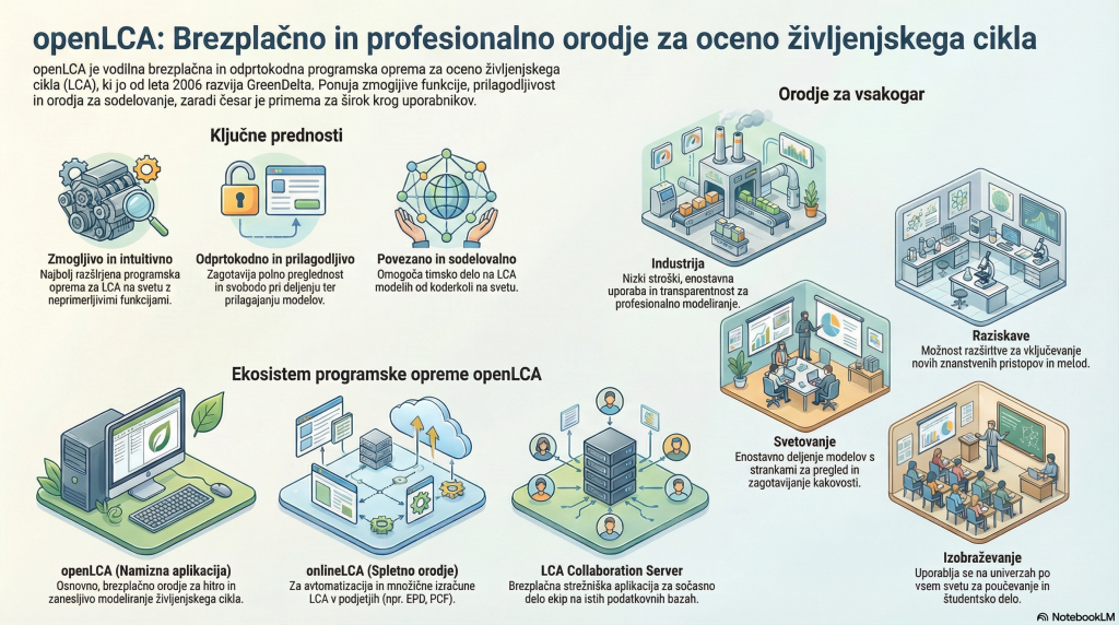 openLCA je brezplačno in odprtokodno računalniško orodje, namenjeno celostnemu ocenjevanju življenjskega cikla (angl. Life Cycle Assessment – LCA) in izračunu okoljskega odtisa izdelkov. Programska oprema, ki jo razvija podjetje GreenDelta, omogoča uporabnikom prilagajanje izvorne kode, dostop do obsežnih podatkovnih baz ter napredno vizualizacijo kompleksnih trajnostnih modelov. Poleg namizne različice ekosistem vključuje tudi spletna orodja za avtomatizacijo izračunov in strežniške rešitve, ki skupinam omogočajo usklajeno sodelovanje na daljavo. Zaradi svoje prilagodljivosti in dostopnosti je platforma postala vodilni pripomoček tako v industrijskem sektorju kot tudi v svetovalnih podjetjih in raziskovalnih ustanovah. Širok nabor funkcij podpira različne standarde, kar olajša pripravo okoljskih deklaracij izdelkov in poučevanje študentov o trajnostnem razvoju.
