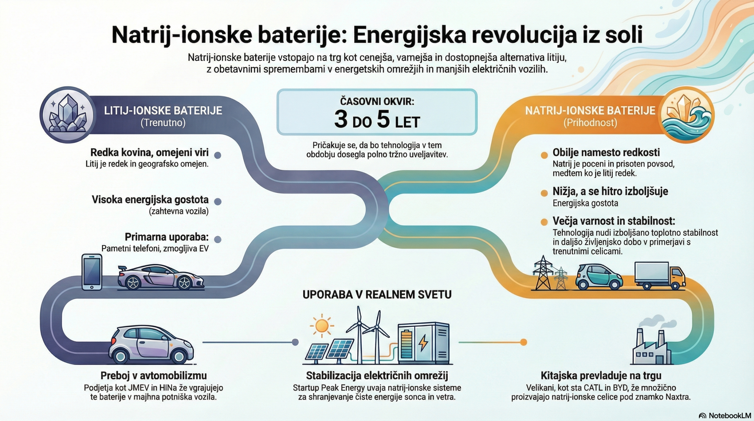 Prispevek opisuje vzpon natrij-ionskih baterij kot ključne tehnološke inovacije, ki predstavlja cenejšo in varnejšo alternativo uveljavljenim litijevim celicam. Zaradi široke dostopnosti natrija in izboljšane termične stabilnosti se ta tehnologija že uveljavlja v električnih vozilih ter pri shranjevanju energije v elektroenergetskih omrežjih. Glavno vlogo pri razvoju imajo kitajska podjetja, kot sta CATL in BYD, ki pospešeno gradijo obrate za serijsko proizvodnjo. Čeprav je njihova energijska gostota trenutno nižja, se učinkovitost baterij nenehno povečuje, kar omogoča uporabo v manjših avtomobilih in logističnih sistemih. Tehnologija obeta znižanje stroškov prehoda na čisto energijo in manjšo odvisnost od redkih surovin. Izvorno besedilo izpostavlja te baterije kot enega od prelomnih dosežkov, ki bodo v prihodnjih letih preoblikovali energetski trg.