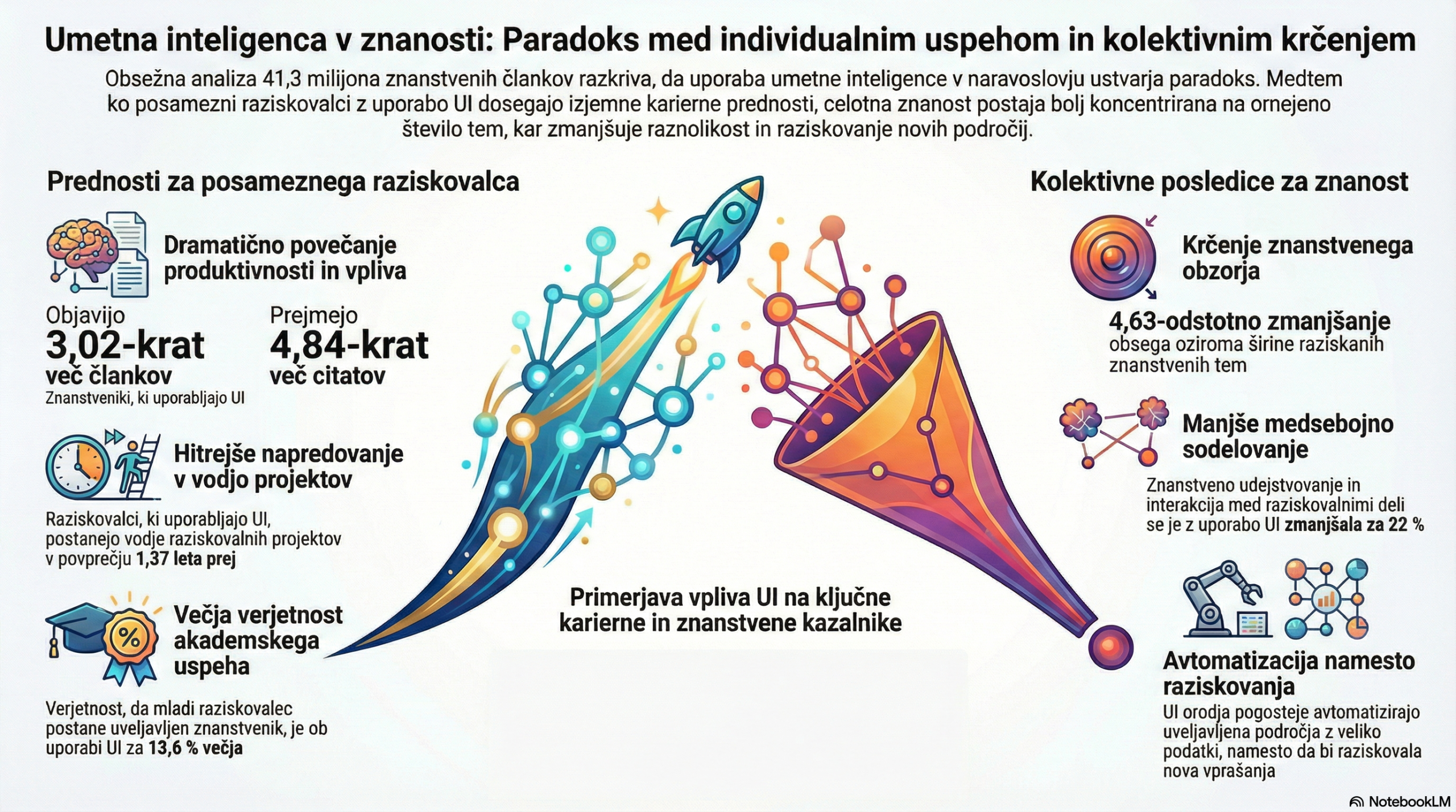 Razvoj umetne inteligence (UI) je pospešil znanstvene odkritje. Poleg nedavnih Nobelovih nagrad, usmerjenih v UI, ti trendi utrjujejo vlogo UI orodij v znanosti. Ta napredek sproža vprašanja o vplivu UI orodij na znanstvenike in znanost kot celoto ter poudarja potencialni konflikt med individualnimi in kolektivnimi koristmi. Da bi ocenili ta vprašanja, smo uporabili vnaprej usposobljen jezikovni model za identifikacijo raziskav, dopolnjenih z UI, z oceno F1 = 0,875 pri validaciji v primerjavi z podatki, ki so jih označili strokovnjaki. Z uporabo podatkovnega niza 41,3 milijona raziskovalnih člankov iz naravoslovnih ved, ki pokrivajo različna obdobja UI, tukaj prikazujemo pospešeno sprejemanje orodij UI med znanstveniki in dosledne poklicne prednosti, povezane z uporabo UI, vendar tudi kolektivno zoževanje znanstvenega fokusa. Znanstveniki, ki se ukvarjajo z raziskavami, dopolnjenimi z umetno inteligenco, objavijo 3,02-krat več člankov, prejmejo 4,84-krat več citatov in postanejo vodje raziskovalnih projektov 1,37 leta prej kot tisti, ki se s tem ne ukvarjajo. Nasprotno pa sprejemanje umetne inteligence zmanjša skupni obseg znanstvenih tem, ki se proučujejo, za 4,63 % in zmanjša sodelovanje znanstvenikov med seboj za 22 %. Posledično uporaba umetne inteligence v znanosti predstavlja navidezno paradoks: povečanje vpliva posameznih znanstvenikov, vendar zmanjšanje kolektivnega dosega znanosti, saj se delo, ki ga dopolnjuje umetna inteligenca, kolektivno premika v smeri področij, ki so najbogatejša z podatki. Zaradi zmanjšanega nadaljnjega sodelovanja se zdi, da orodja umetne inteligence avtomatizirajo uveljavljena področja, namesto da bi raziskovala nova, kar poudarja napetost med osebnim napredkom in kolektivnim znanstvenim napredkom.