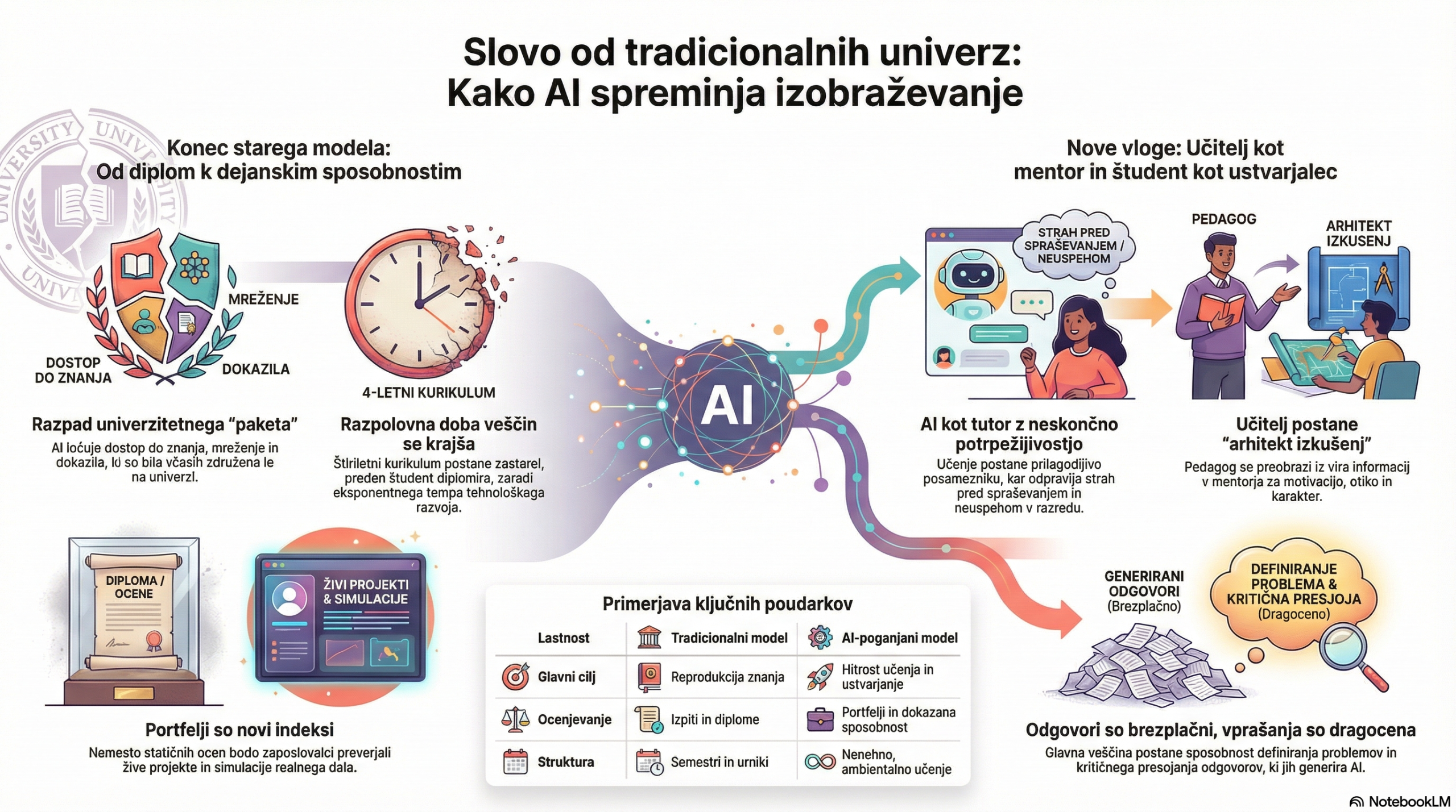 Video prispevek napoveduje korenito preobrazbo izobraževanja, saj umetna inteligenca (UI) odpravlja monopol tradicionalnih univerz nad znanjem, mreženjem in pridobivanjem diplom. Klasična predavanja postajajo zastarela, saj UI omogoča prilagojeno učenje, ki se osredotoča na posameznikovo hitrost in premagovanje strahu pred neuspehom. V novi dobi vsebina postaja brezplačna dobrina, zato se vrednost seli h kritičnemu razmišljanju, postavljanju pravih vprašanj in praktičnemu dokazovanju sposobnosti prek projektov. Namesto statičnih štiriletnih programov v ospredje stopa vseživljenjsko učenje v realnem času, kjer so ključne veščine prilagodljivost, značaj in hitrost usvajanja novih spoznanj. Univerze bodo preživele le, če se bodo preoblikovale iz podajalcev informacij v okolja za globoko transformacijo, ki gradijo človeško odpornost in etično presojo. Prihodnost izobraževanja tako ni več v sledenju navodilom, temveč v uporabi UI kot orodja za ustvarjanje neposrednega vpliva na svet.