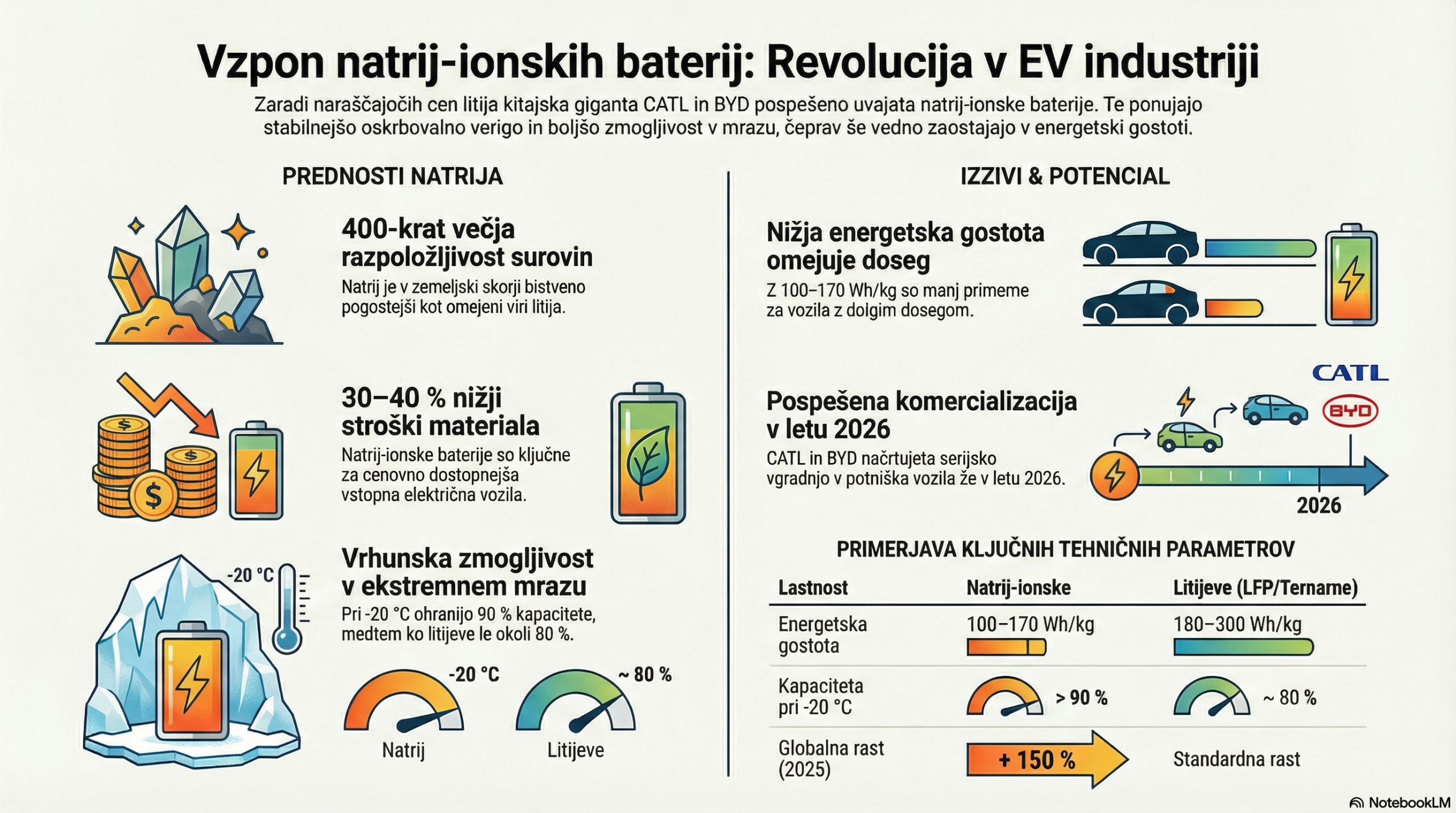 Prispevek na spletnem portali Car News China v rubriki električnih vozil (EV) oz. priključnih hibridnih električnih vozil (PHEV) o tem, kako vodilni kitajski proizvajalci baterij, kot sta CATL in BYD, pospešeno razvijajo natrij-ionsko tehnologijo zaradi naraščajočih cen litija in omejitev v dobavnih verigah. Ta alternativa uporablja bistveno dostopnejše surovine, kar omogoča znatno znižanje stroškov proizvodnje, zlasti za cenovno ugodna električna vozila. Čeprav imajo te baterije manjšo energijsko gostoto kot litijeve, se izkažejo z izjemno odpornostjo na mraz in stabilnim delovanjem v ekstremnih pogojih. Leto 2026 velja za ključno prelomnico v komercializaciji, saj se proizvodne zmogljivosti širijo, tehnologija pa prehaja v serijsko uporabo. Natrij-ionske celice bodo sprva dopolnjevale trg v segmentih shranjevanja energije in vozil krajšega dosega, kjer je ekonomičnost pomembnejša od maksimalne zmogljivosti.