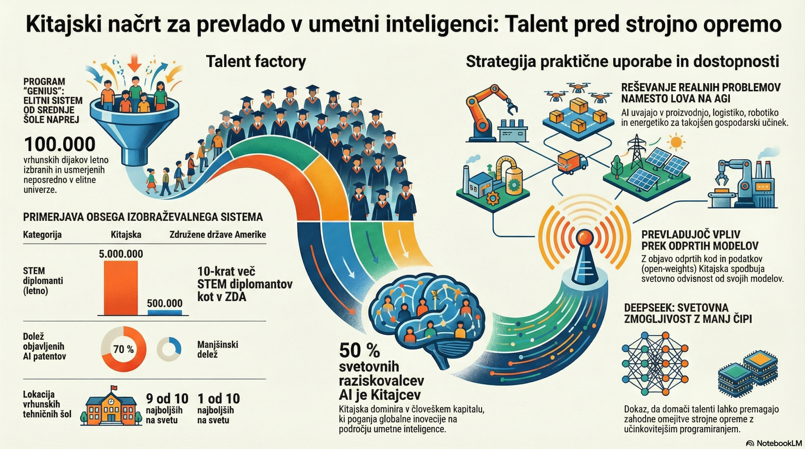Video posnetek (12:51) na YouTube kanalu Cyrus Janssen pojasnjuje, da je Kitajska v prednosti v tekmi za umetno inteligenco zaradi več desetletij dolgega vlaganja v razvoj vrhunskih talentov. Namesto osredotočanja zgolj na strojno opremo je država vzpostavila sistematičen “program za genije”, ki vsako leto identificira in izobražuje na tisoče nadarjenih študentov s področja naravoslovja. Vir poudarja, da ameriške omejitve izvoza čipov niso ustavile kitajskega napredka, temveč so državo prisilile v razvoj praktičnih aplikacij in odprtokodnih modelov. Medtem ko Zahod teži k splošni umetni inteligenci, Kitajska svojo tehnologijo hitro integrira v industrijo, robotiko in vsakdanje storitve. Uspeh modela DeepSeek služi kot dokaz, da so domači strokovnjaki pomembnejši od dostopa do tujih polprevodnikov. Na koncu avtor izpostavi podjetje Resolve AI kot primer naložbene priložnosti, ki izkorišča praktično uporabo generativne umetne inteligence v e-poslovanju.