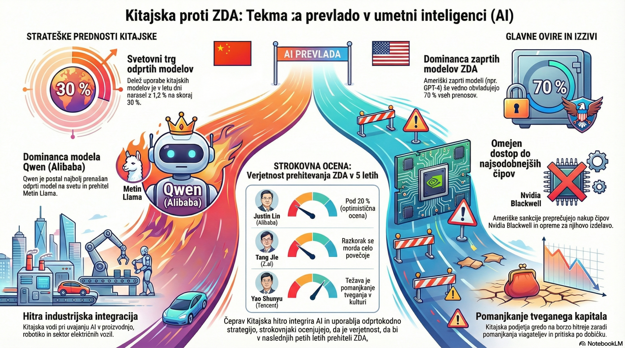 - Povečevanje razlike: Vodilni v industriji opozarjajo, da se razkorak v zmogljivosti verjetno povečuje in ne zmanjšuje, saj ameriška podjetja (kot sta OpenAI in Anthropic) vlagajo ogromno računalniško moč v raziskave naslednje generacije, medtem ko so viri kitajskih podjetij bolj omejeni.