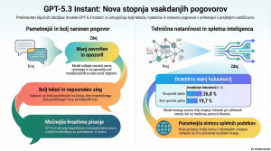 Prispevek na spletnem portalu OpenAI napoveduje izid posodobljenega modela GPT-5.3 Instant, ki prinaša tekoče in naravne pogovore z manj nepotrebnimi opozorili. Nova različica se osredotoča na večjo natančnost, izboljšano iskanje po spletu in bolj neposredne odgovore brez pretiranega moraliziranja. V primerjavi s predhodnikom model izkazuje močnejše pisne sposobnosti in boljše razumevanje konteksta v vsakdanjih situacijah. Tehnološki napredek vključuje tudi znatno […]