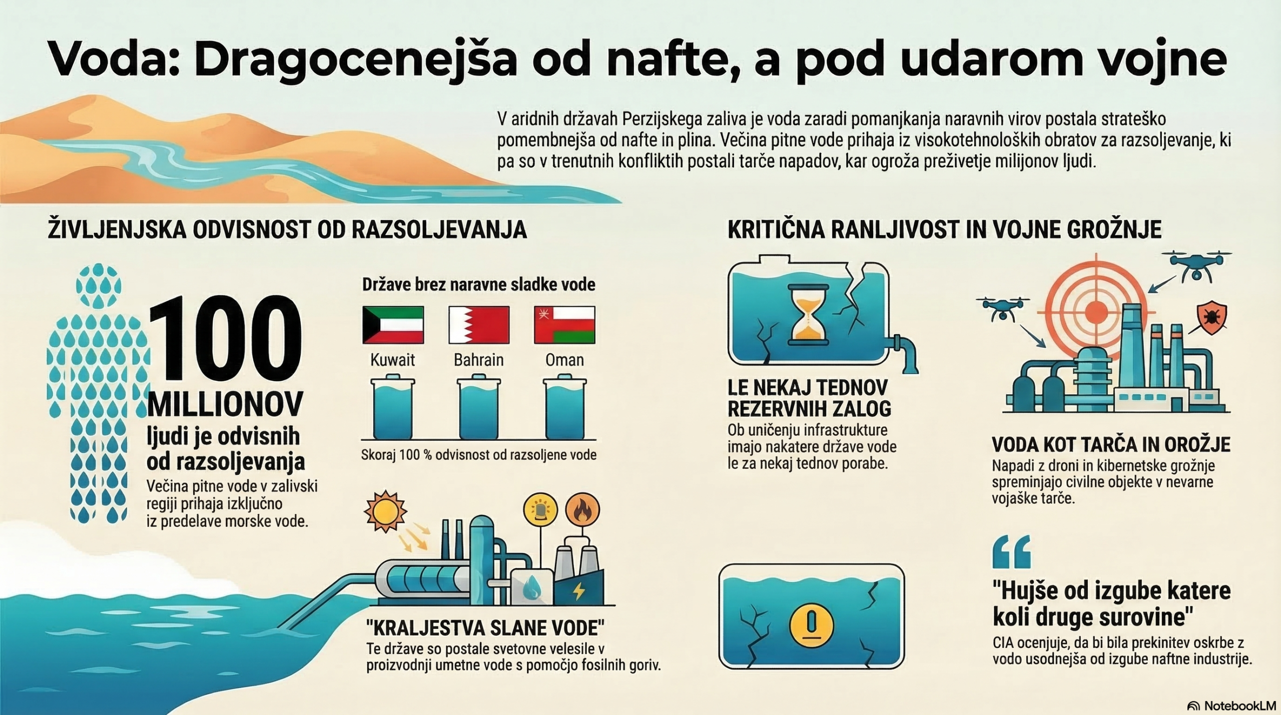 Prispevek na spletnem portalu CNN Climate obravnava kritično odvisnost držav Perzijskega zaliva od razsoljevanja morske vode, ki je za preživetje regije pomembnejše od nafte. Zaradi pomanjkanja naravnih sladkovodnih virov so te države zgradile obsežno infrastrukturo, ki pa v času naraščajočih vojaških napetosti postaja primarna tarča. Nedavni incidenti z droni in kibernetskimi napadi nakazujejo, da se norme vojskovanja spreminjajo, saj voda vedno pogosteje služi kot strateško orožje. Strokovnjaki opozarjajo, da bi uničenje teh obratov povzročilo nepredstavljivo humanitarno krizo, saj imajo nekatere države le za nekaj tednov zalog. Poleg vojnih groženj dolgoročno tveganje predstavljajo tudi podnebne spremembe, ki dodatno obremenjujejo vodne vire. Celotna regija se tako sooča z eksistencialno ranljivostjo, kjer je dostop do pitne vode neposredno povezan z varnostjo in stabilnostjo.