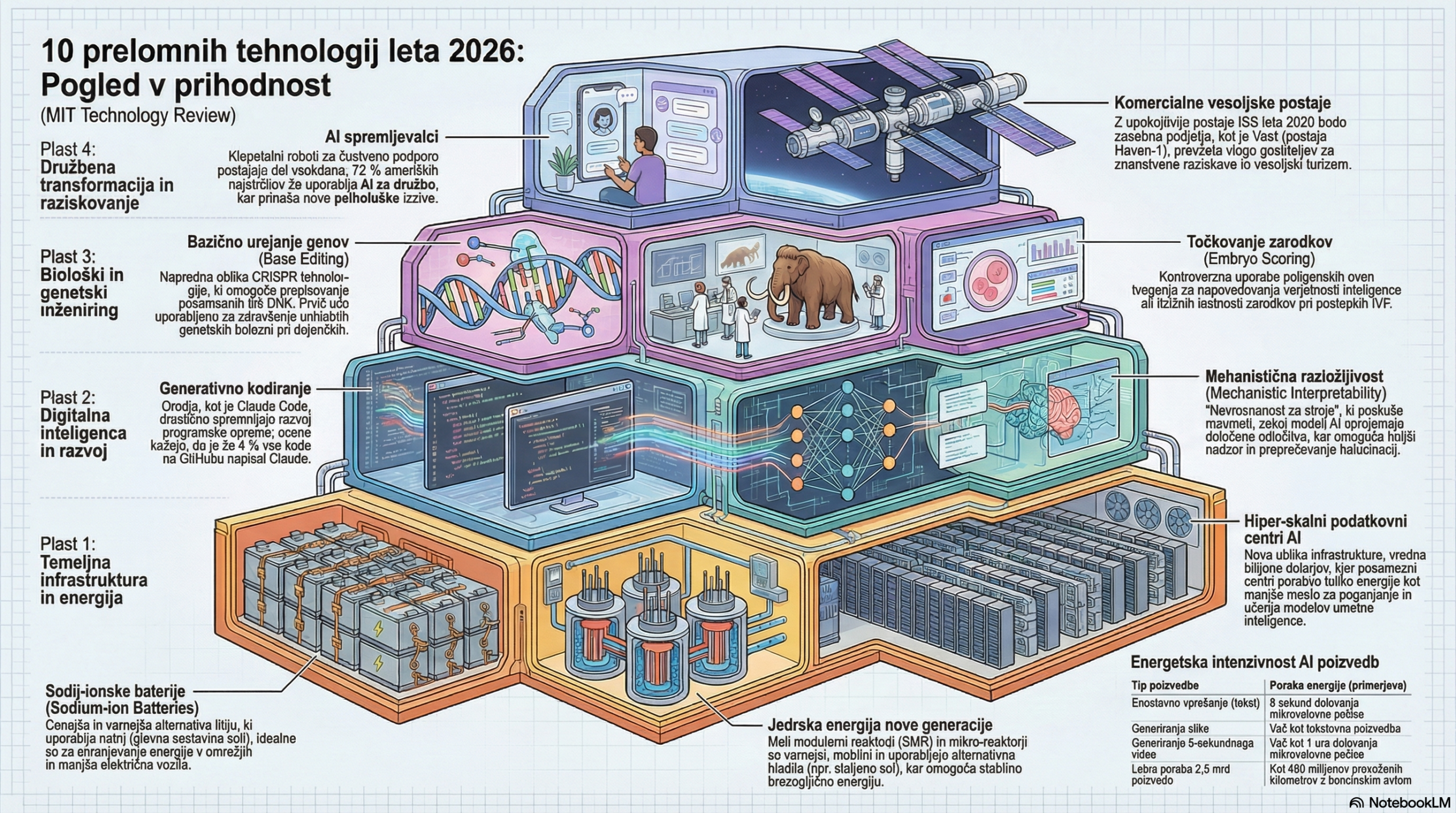 Video posnetek povzema predavanje izvršnega urednika revije MIT Technology Review, ki predstavlja deset prelomnih tehnologij za leto 2026. Avtor pojasnjuje zahtevnost napovedovanja prihodnosti, pri čemer poudarja pomen dolgoročnega vpliva inovacij na družbo, gospodarstvo in posameznika. Med ključnimi izpostavljenimi področji so natrijeve baterije, napredna generativna koda in novi jedrski reaktorji, ki obetajo korenite spremembe v energetiki. Govorec obravnava tudi etično sporna vprašanja, kot sta gensko urejanje dojenčkov in uporaba umetne inteligence za druženje, ki prinašata tveganja za čustveno odvisnost. Razprava vključuje vpogled v delovanje velikih jezikovnih modelov ter okoljski vpliv ogromnih podatkovnih centrov. Celoten pregled služi kot poziv k boljši pripravi na prihodnost, ki jo tehnologija neizogibno oblikuje.