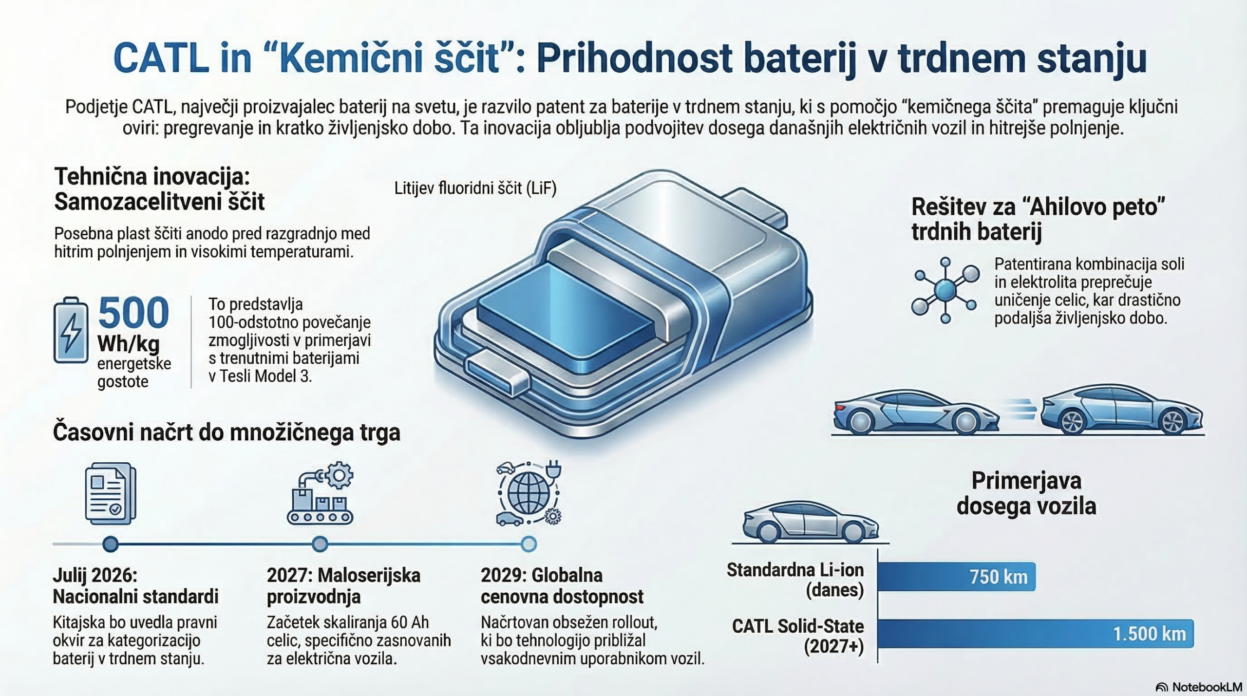 Podjetje CATL, ki je vodilni svetovni proizvajalec baterij, je razvilo in patentiralo prelomno tehnologijo za trdnofazne baterije, ki rešuje težave s kratko življenjsko dobo in pregrevanjem. Njihova inovacija vključuje poseben kemični ščit, ki med delovanjem samodejno ustvari zaščitno plast in omogoča varno, ekstremno hitro polnjenje. Te nove celice dosegajo izjemno energijsko gostoto, kar bi lahko podvojilo doseg električnih vozil na več kot tisoč kilometrov. Čeprav je poskusna proizvodnja že stekla, se širša uporaba v avtomobilski industriji pričakuje okoli leta 2027, s polnim tržnim razmahom do konca desetletja. Ta napredek predstavlja ključni korak k prevladi električnih vozil nad avtomobili z notranjim izgorevanjem, saj zagotavlja vzdržljivost in zmogljivost brez primere.