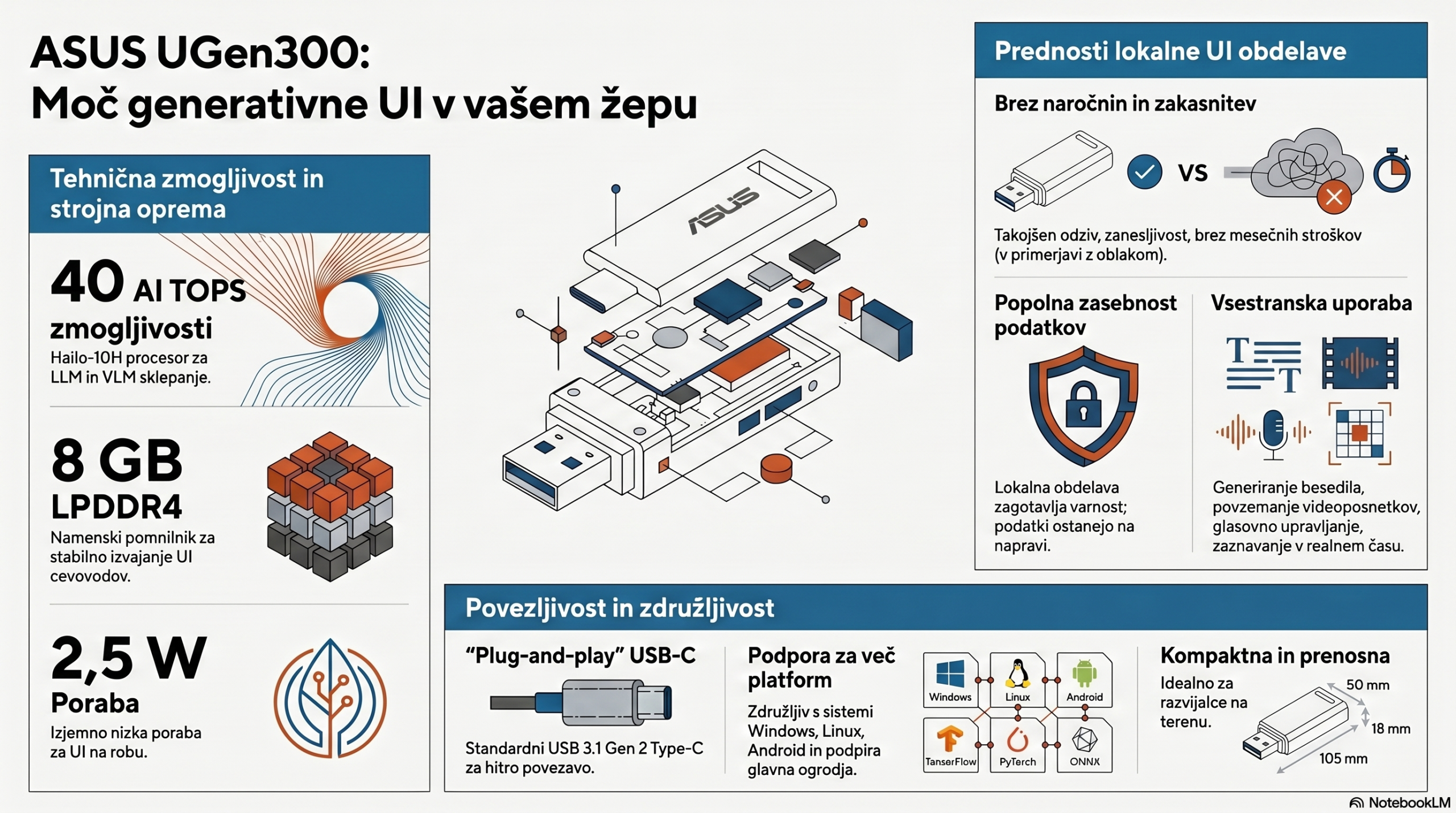 Prispevek na spletnem portalu podjetja ASUS v rubriki Pressroom predstavlja UGen300 USB AI Accelerator, ki velja za prvo tovrstno prenosno napravo za lokalno poganjanje generativne umetne inteligence. Majhen modul uporablja procesor Hailo-10H in nudi 40 TOPS zmogljivosti, kar omogoča delovanje kompleksnih jezikovnih modelov brez povezave z oblakom. Naprava vključuje 8 GB namenskega pomnilnika in deluje prek vmesnika USB-C, kar zagotavlja preprosto uporabo na različnih operacijskih sistemih. Z nizko porabo energije in podporo priljubljenim ogrodjem, kot sta TensorFlow in PyTorch, je izdelek namenjen razvijalcem in izobraževalcem. Ta strojna oprema uporabnikom omogoča večjo zasebnost, hitrejše odzivne čase in nižje stroške brez potrebe po mesečnih naročninah.