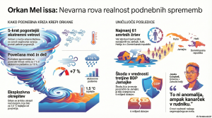 Prispevek na spletnem portalu časnika The Guardian o orkanu Melissa, ki je najmočnejši tropski orkan, ki je kadarkoli prizadel Jamajko. V nadaljevanju podajamo povzetek prispevka. Katastrofalne posledice orkana Melissa Poslabšanje zaradi podnebnih sprememb Zahteva po podnebnem financiranju URL: https://www.theguardian.com/world/2025/nov/06/hurricane-melissa-storm-strength-climate-crisis